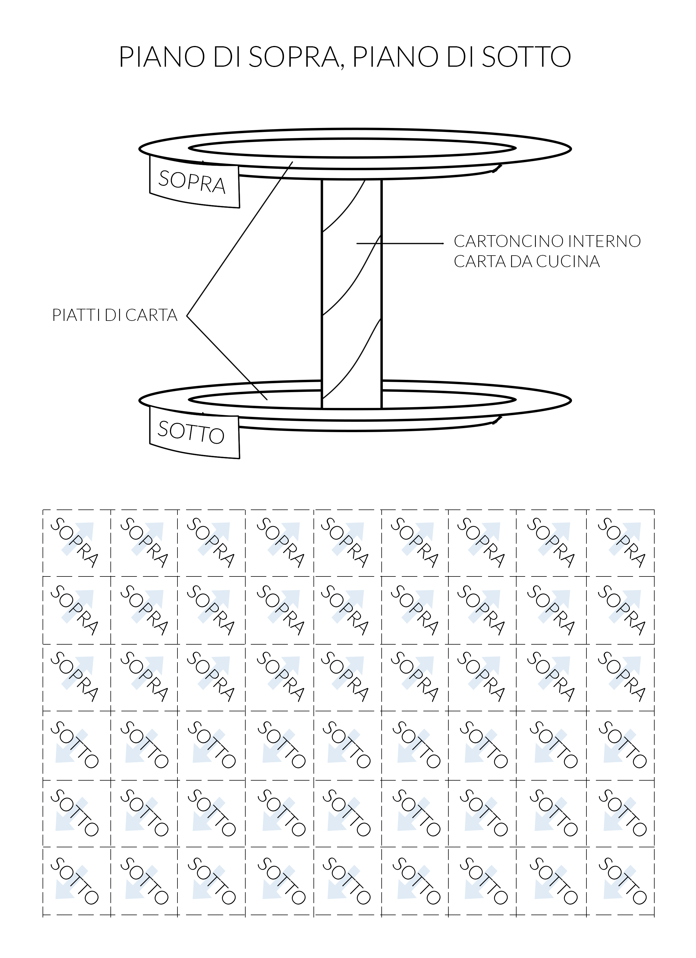 Costruite un vassoio doppio usando due piatti e un rotolo di cartone della carta da cucina. collegate i due piatti usando il rotolo di carta da cucina: un piatto sopra, un piatto sotto, attaccati con il nastro adesivo. Seguite le istruzioni sulla scheda e ritagliate le pedine sopra-sotto. Chiedete ai bambini di posizionare ciascuna pedina al posto giusto, nel piatto sopra o nel piatto sotto.