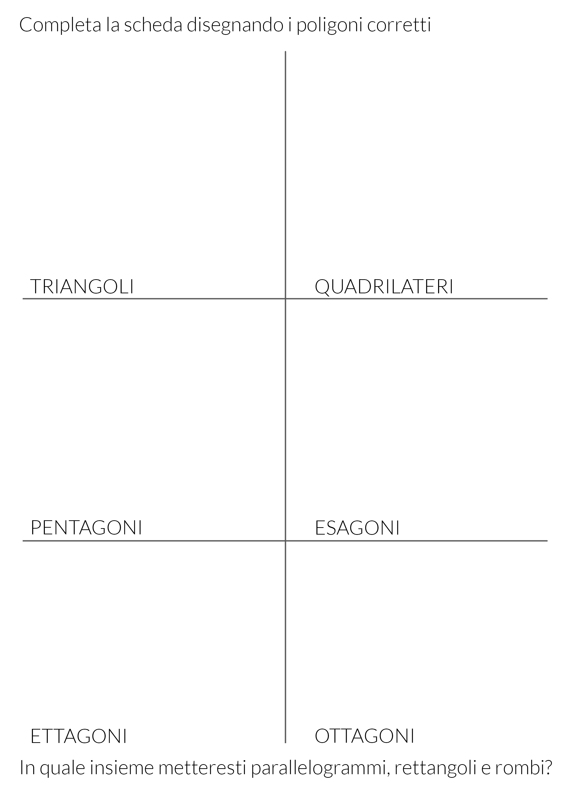 Proponiamo poi un’attività di disegno per imparare a classificare i poligoni correttamente, in base al numero di lati: triangoli, quadrilateri, pentagoni… Potete riproporre la stessa attività facendo loro classificare le impronte/le sagome degli oggetti che si trovano in classe: in quale insieme dovremmo posizionare il quaderno? In quale la gomma? E così via…