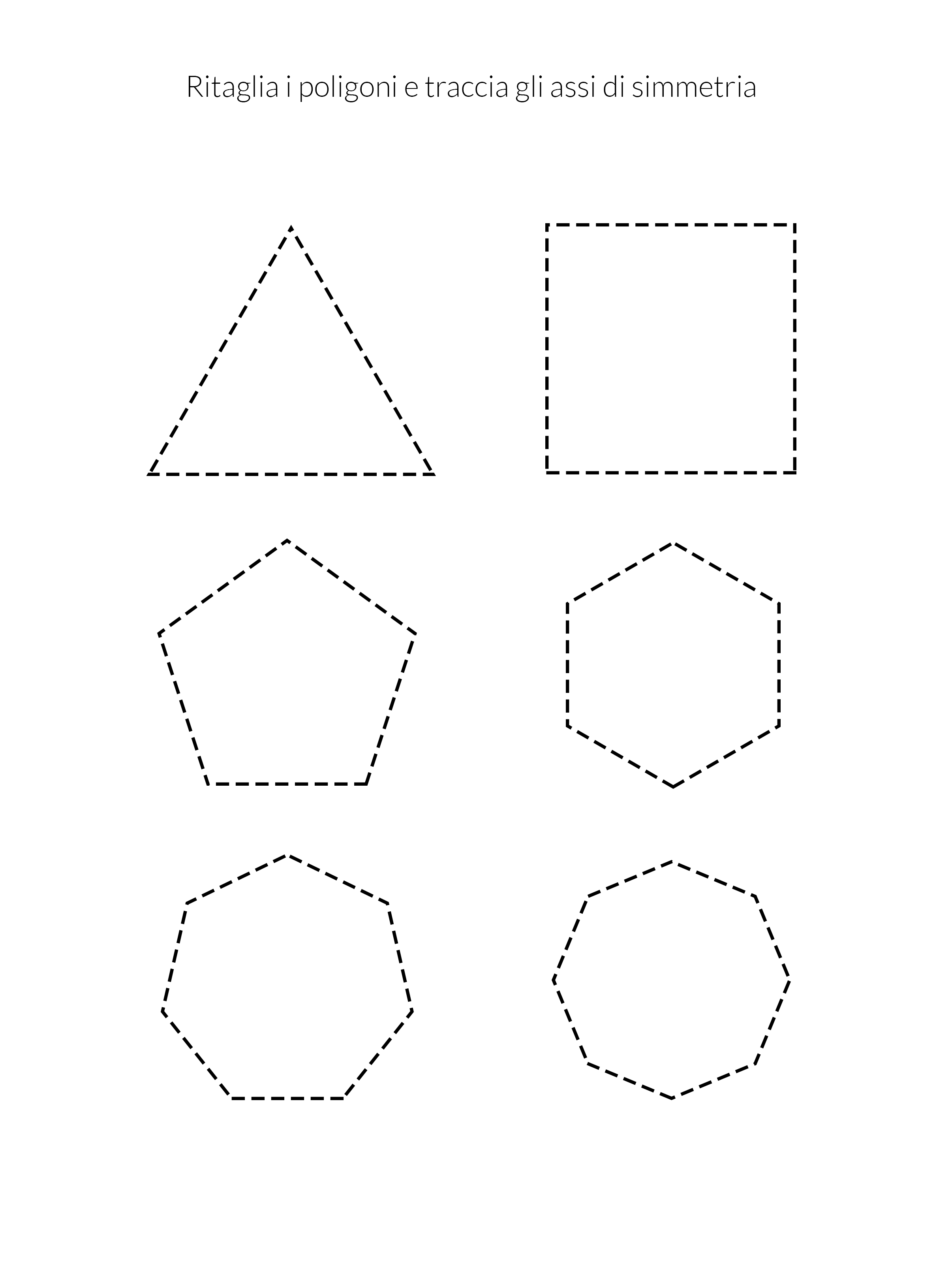 Riesci a trovare tutti gli assi di simmetria di un poligono regolare? Mettiti alla prova con la nostra scheda: ritaglia i poligoni e prova a trovare tutti i loro assi di simmetria, disegnandoli con matita e righello o piegandoli su loro stessi.