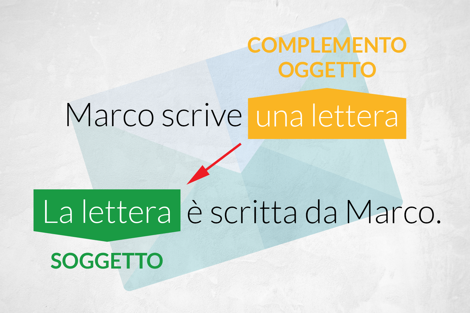 Se invece diciamo “La lettera è scritta da Marco” il significato è lo stesso, ma abbiamo trasformato la frase al passivo. “La lettera” non è più il complemento oggetto su cui ricade l’azione di scrivere compiuta da Marco, ma è diventata il soggetto della nuova proposizione. Si tratta però di un soggetto che non compie nessuna azione, anzi la subisce, e quindi il verbo è passivo.