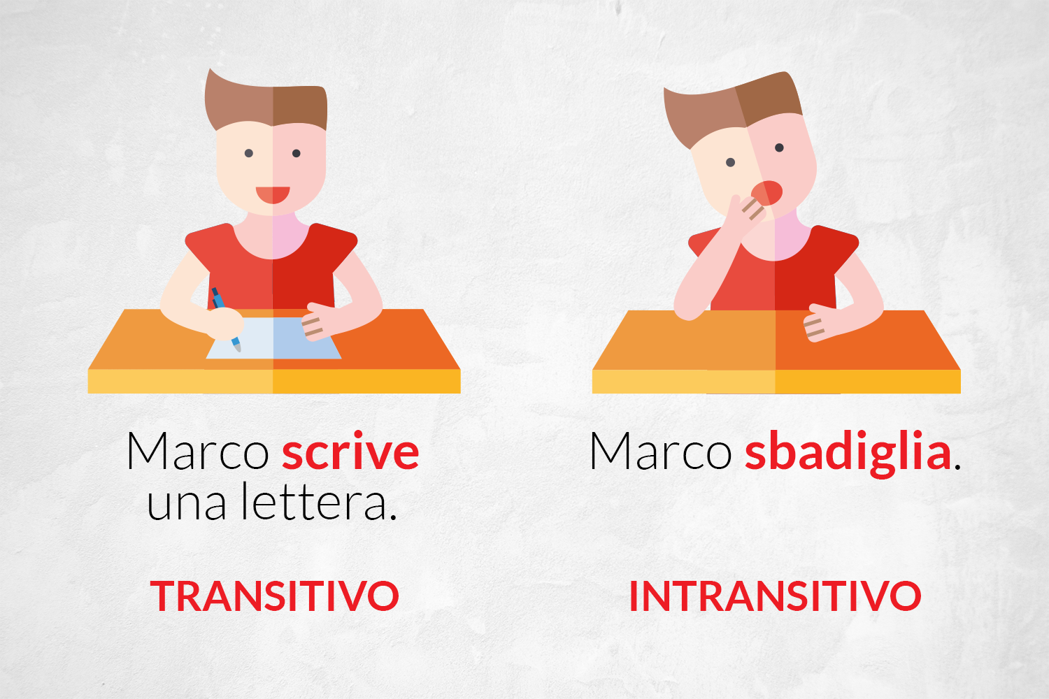 - transitivi, che esprimono un’azione che “transita” direttamente dal soggetto all’oggetto (il complemento diretto). Esempio: “Marco scrive una lettera”;