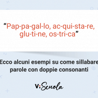 - Consonanti da separare: le “doppie” e il gruppo “cq”. Ad esempio: pap-pa-gal-lo, ca-ra-mel-la, ac-qua, ac-qui-sta-re