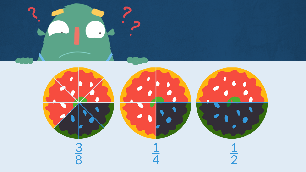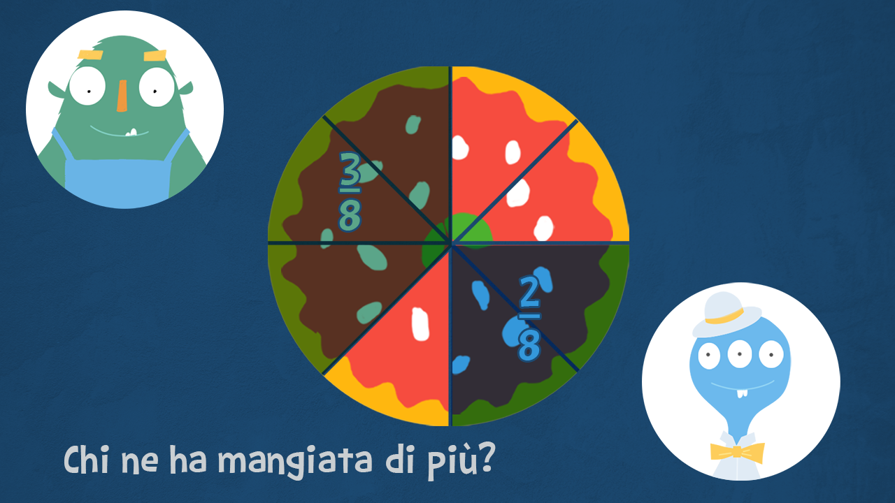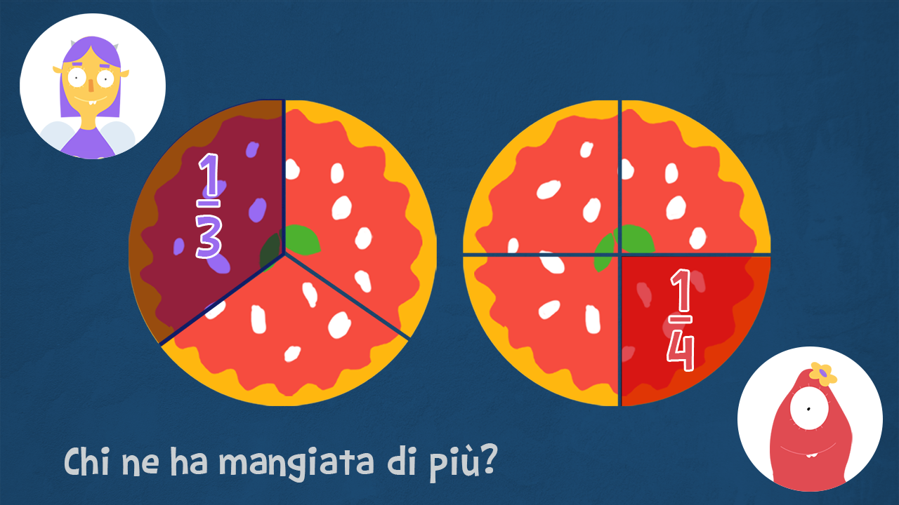 Siamo di fronte a due frazioni che hanno lo stesso numeratore: ciò significa che abbiamo considerato lo stesso numero di parti di un intero, in questo caso 1. Dobbiamo quindi controllare in quante parti è stato suddiviso l’intero: più è grande il denominatore, più sono le parti in cui è stato suddiviso l’intero, di conseguenza le fette di pizza saranno più piccole.