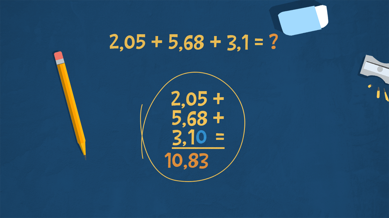 Quando eseguiamo un’addizione o una sottrazione con numeri decimali, è importante allineare i punti decimali, cioè tutte le cifre che ci sono dopo la virgola. Questo può significare che dovremmo aggiungere zeri dopo la cifra decimale, per fare in modo che ogni numero abbia lo stesso numero di cifre decimali. Una volta allineati i punti decimali, le operazioni possono essere eseguite come se fossero addizioni e sottrazioni di numeri interi, basta soltanto ricordare dov’è la virgola!