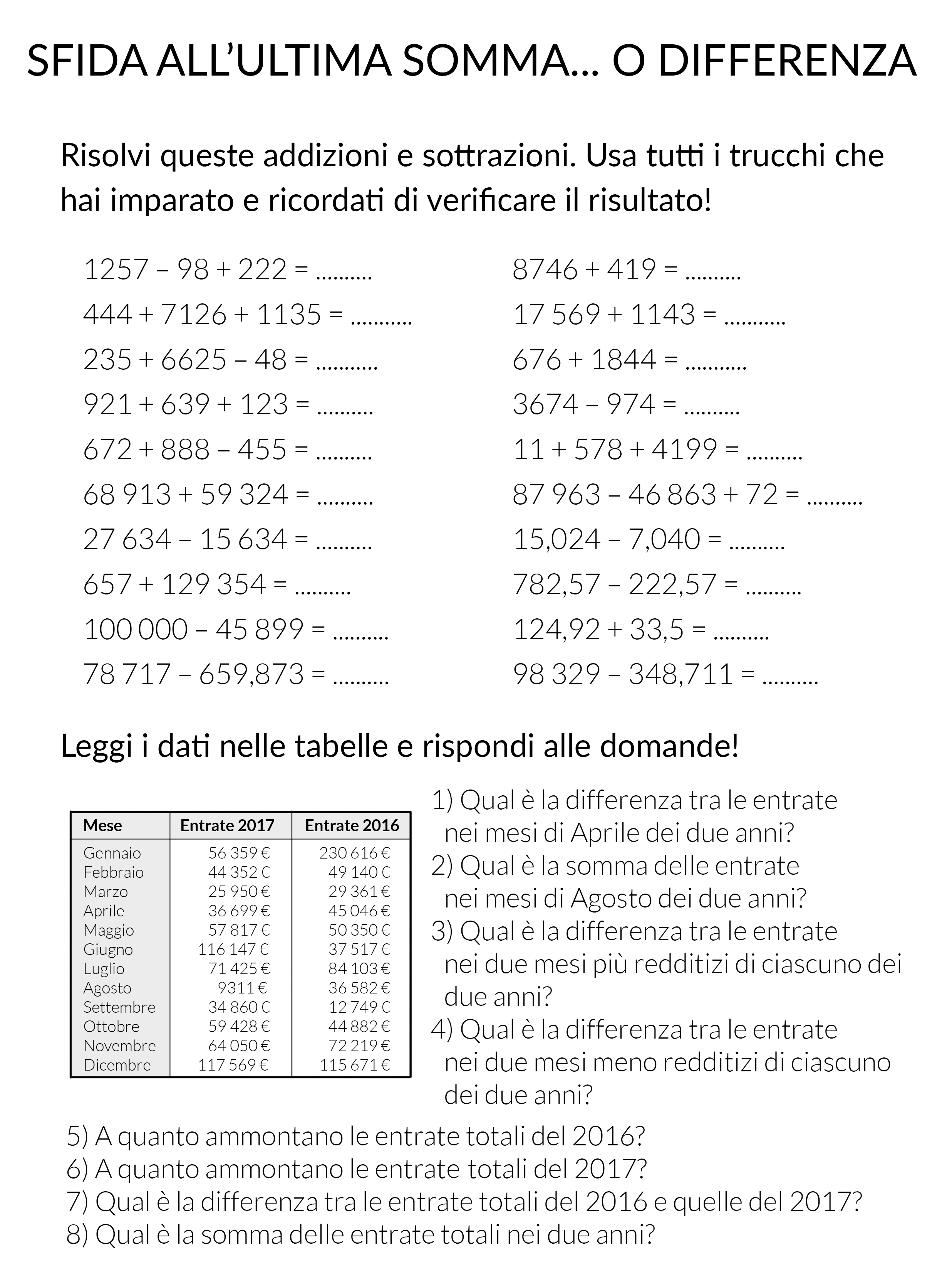Siamo sicuri di aver capito bene addizioni e sottrazioni? Prova gli esercizi della nostra scheda: tanti conti per provare ad applicare questi trucchi e velocizzare i conti.
