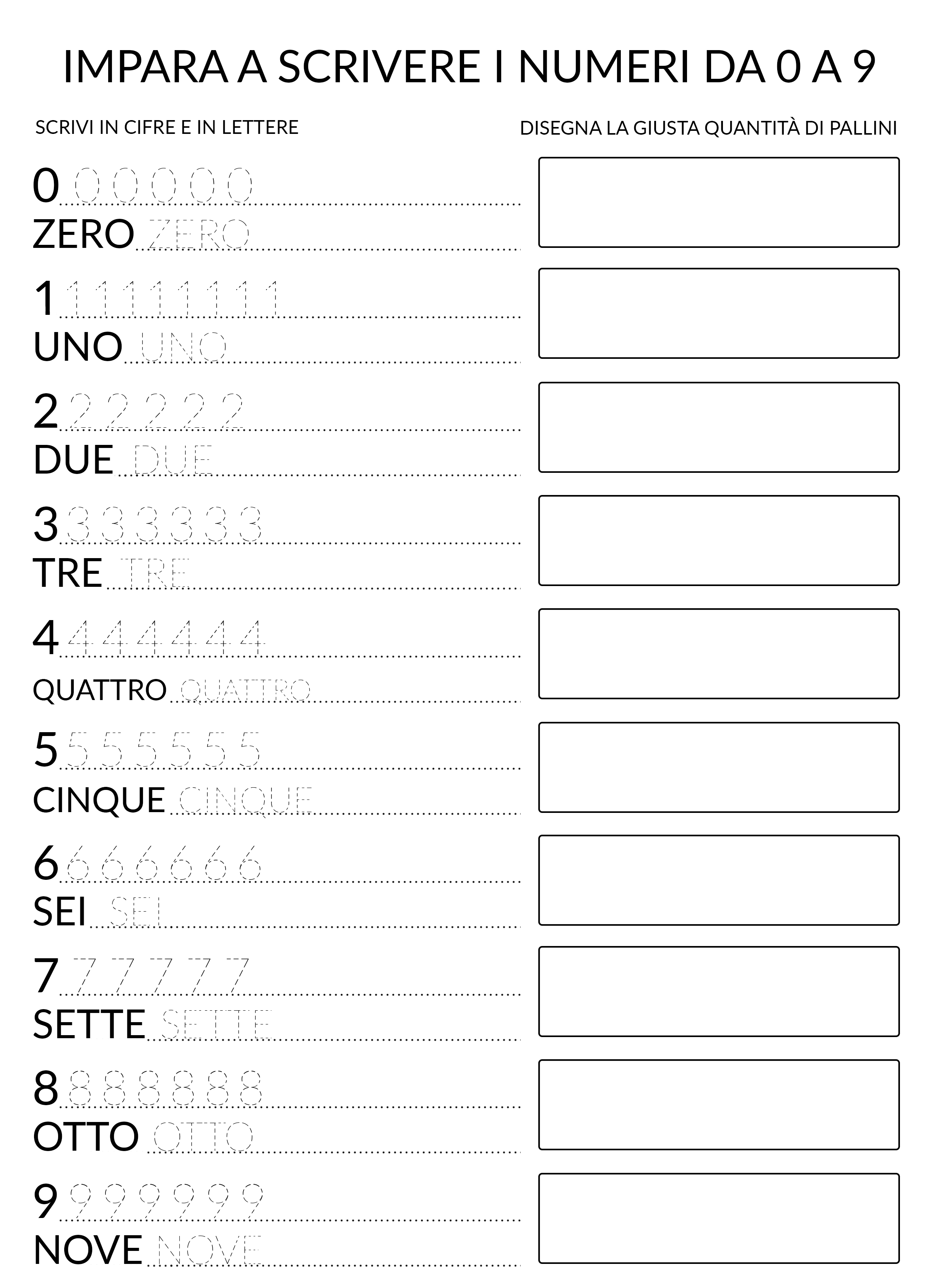 Con questa scheda i bambini impareranno a scrivere i numeri da 0 a 9, in cifre e in lettere, e ad accostarli alle quantità che rappresentano.