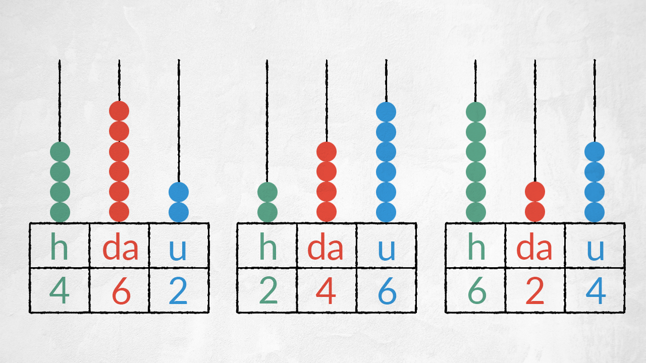 - nel secondo numero abbiamo 2 h, 4 da, 6 u.