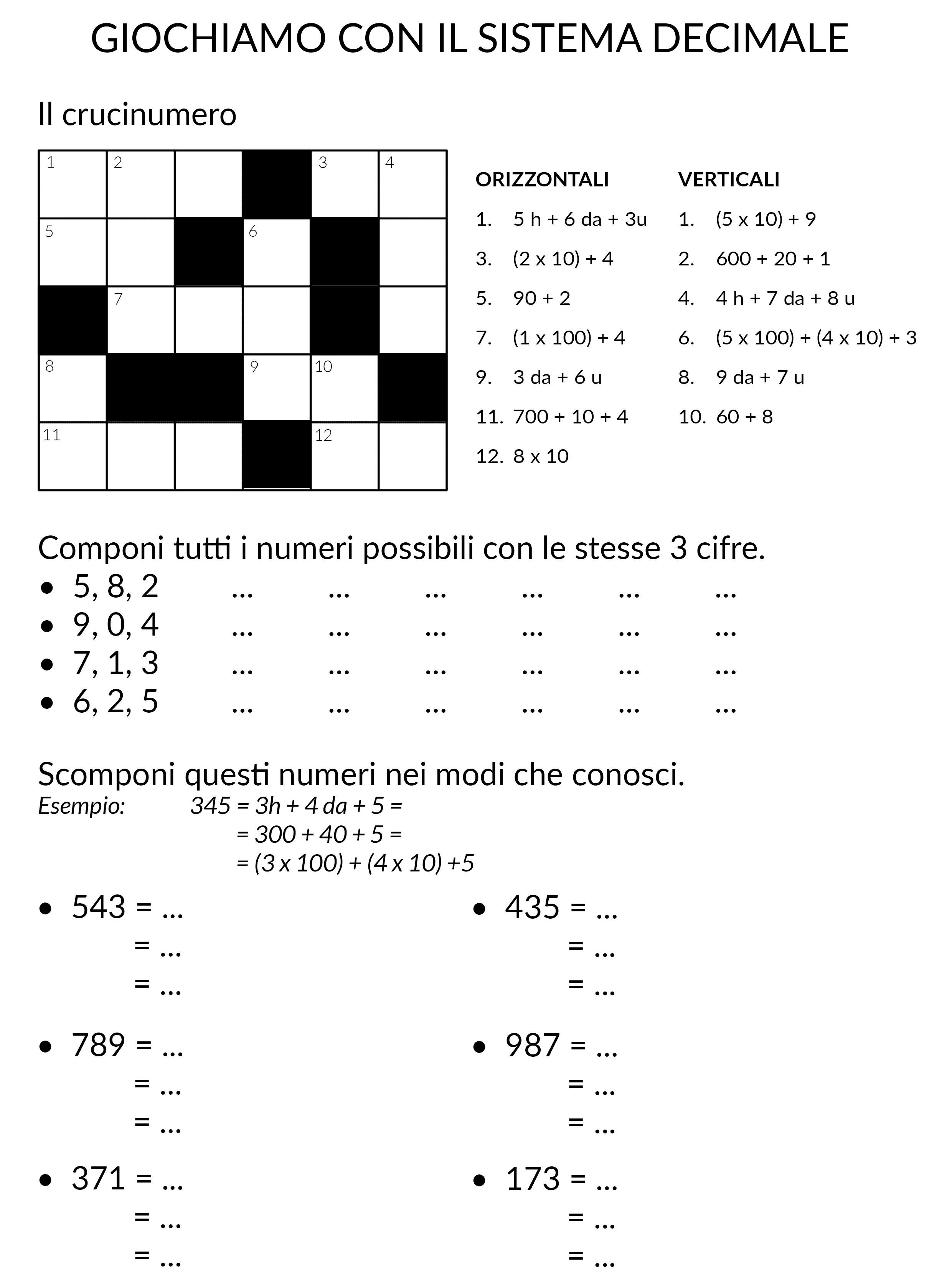 Il valore di ciascuna cifra cambia a seconda della posizione nel numero. Con questa scheda, i bambini potranno imparare a riconoscere il diverso valore di ciascun numero attraverso i colori e le scomposizioni in centinaia, decine e unità. Proponiamo un crucinumero e qualche esercizio standard per prendere confidenza con il sistema di numerazione decimale posizionale.
