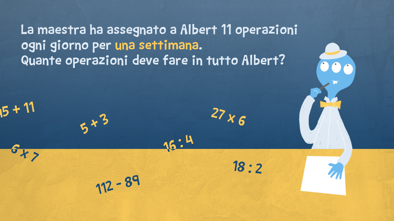 Anche se non ci sono altri numeri, dobbiamo prendere come dato utile la durata temporale, cioè una settimana. Così scopriamo che Albert deve risolvere 11 operazioni al giorno per 7 giorni.
