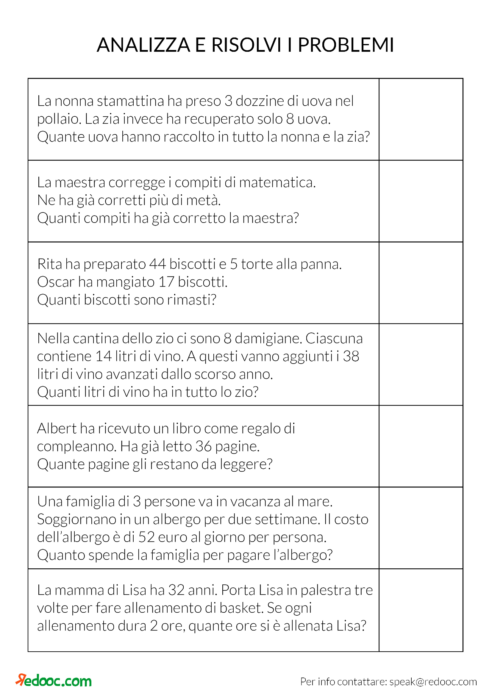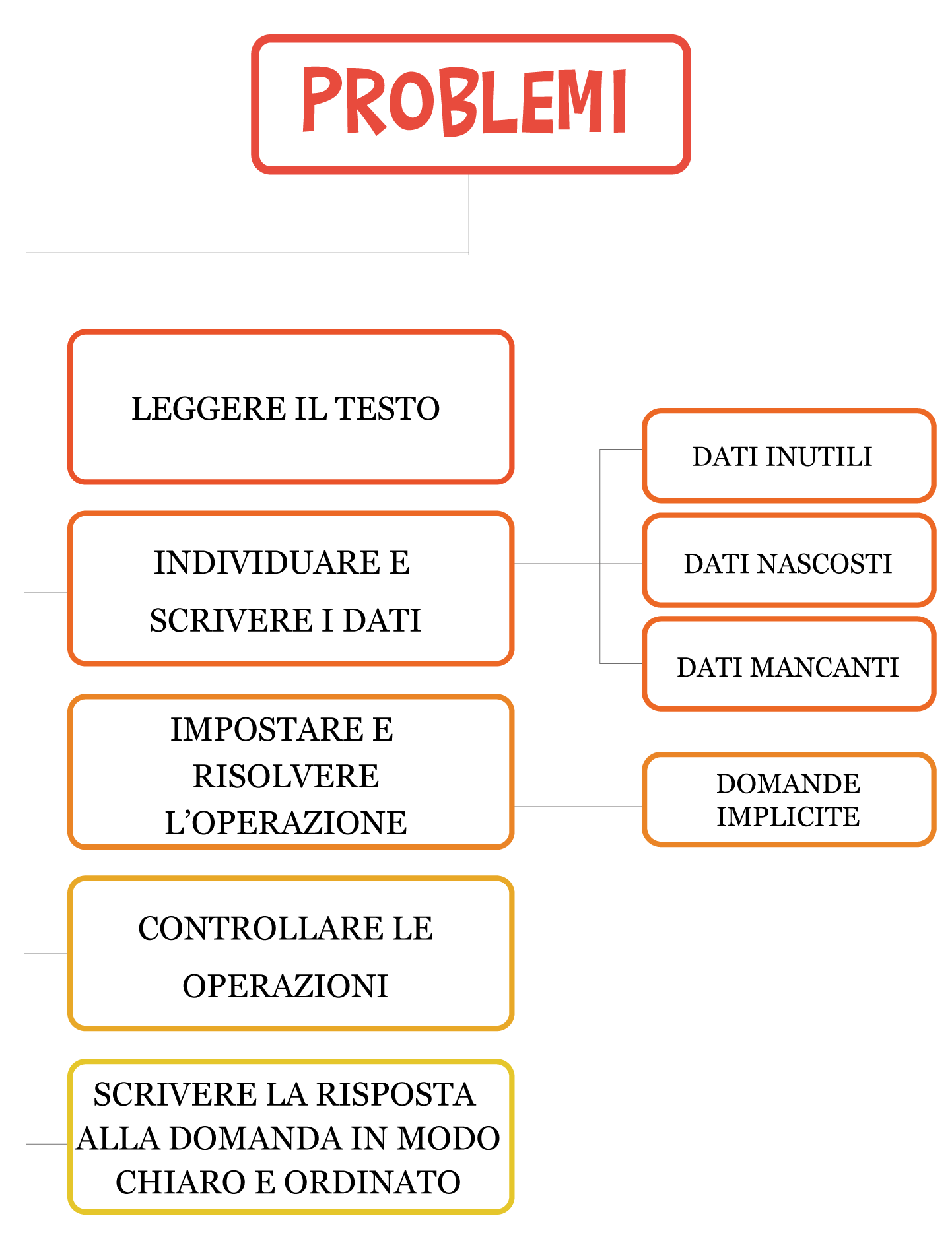 La difficoltà maggiore starà nel riconoscere se utilizzare un’addizione, una sottrazione, una moltiplicazione o una divisione. Può capitare che siano necessari calcoli diversi per arrivare alla risposta e alla soluzione del problema.