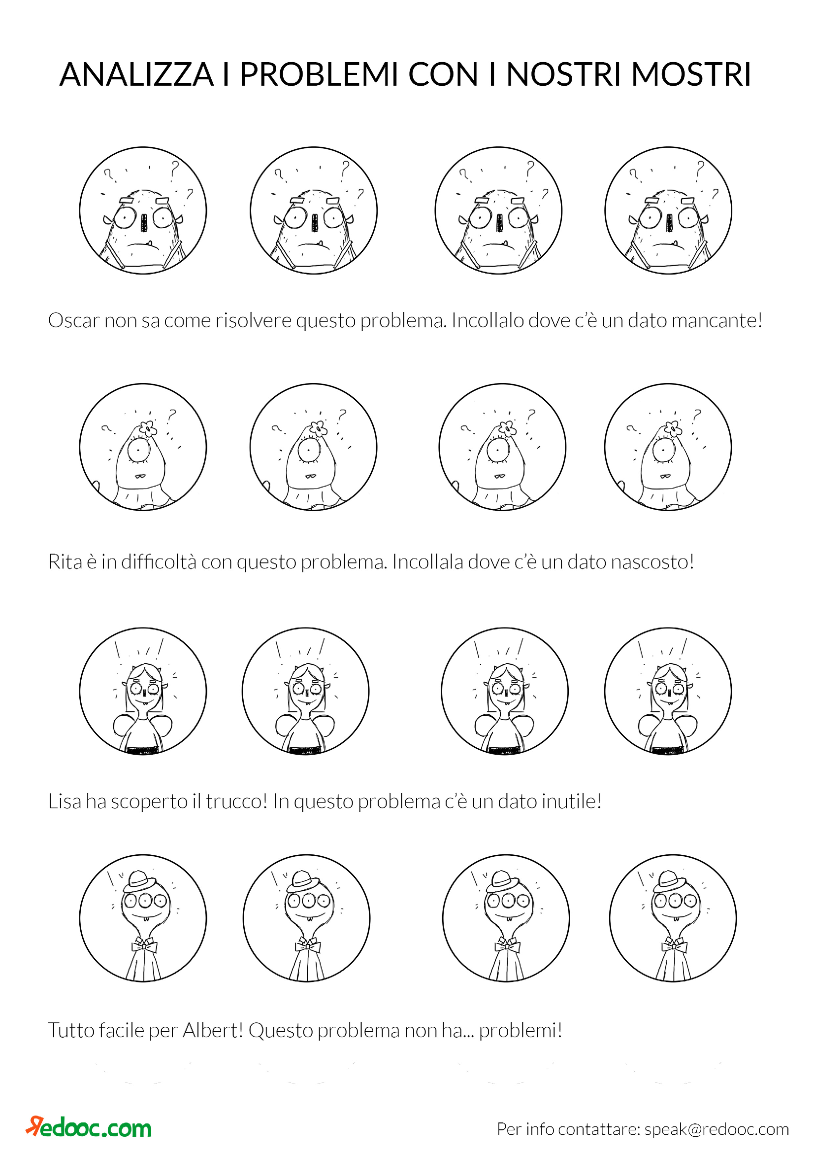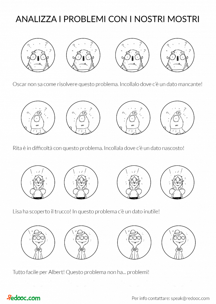 La parte più importante è sempre la prima: leggere il testo. Allora ecco che proponiamo un’attività divertente per far ragionare i ragazzi sulle informazioni che compaiono nel testo del problema. Leggete i problemi e riconoscete i dati presenti nel testo. Quale faccina va associata a ciascun problema? Seguite le istruzioni nella seconda scheda: colorate i mostri e attaccateli al posto giusto. Scarica qui la scheda: .