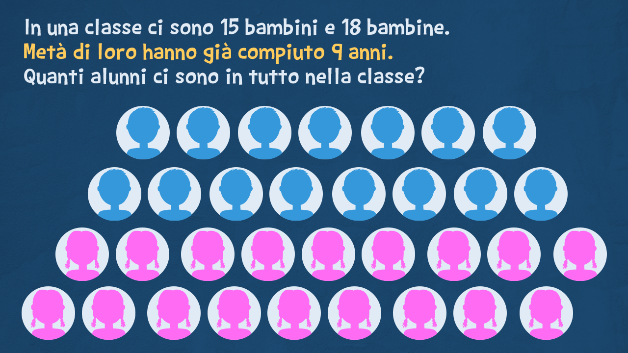 Leggiamo la domanda del problema di esempio: “quanti alunni ci sono in tutto nella classe?".