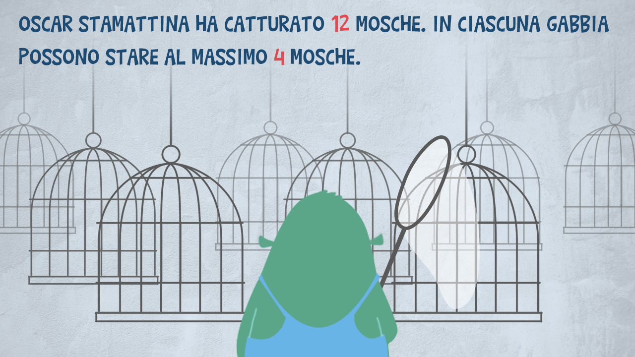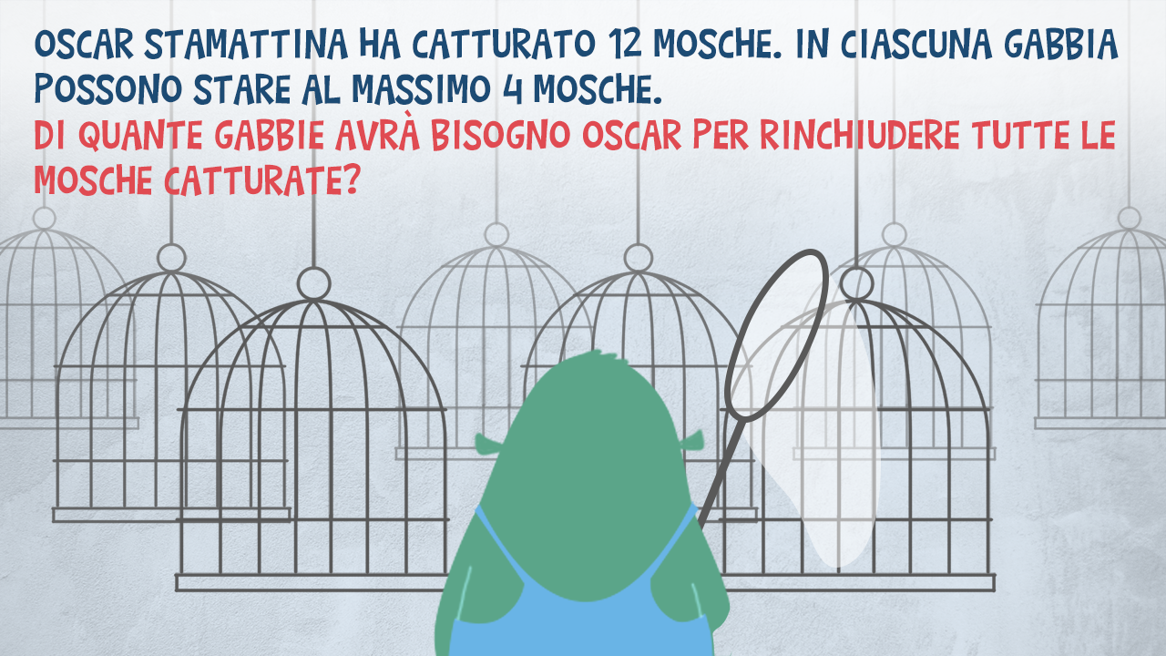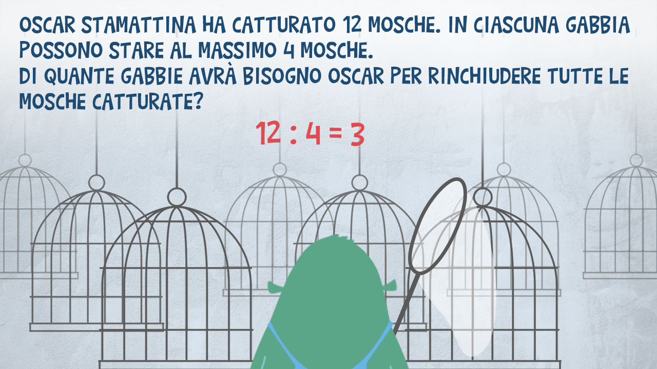 Oscar cattura 12 mosche, ma una volta che le ha catturate, deve rinchiuderle perché non scappino più. In ciascuna gabbia ce ne stanno solo 4, quindi di quante gabbie ha bisogno? Per scoprirlo dobbiamo fare una divisione: 12 : 4 = 3. Oscar avrà bisogno di 3 gabbie per poter rinchiudere tutte le mosche che ha catturato.