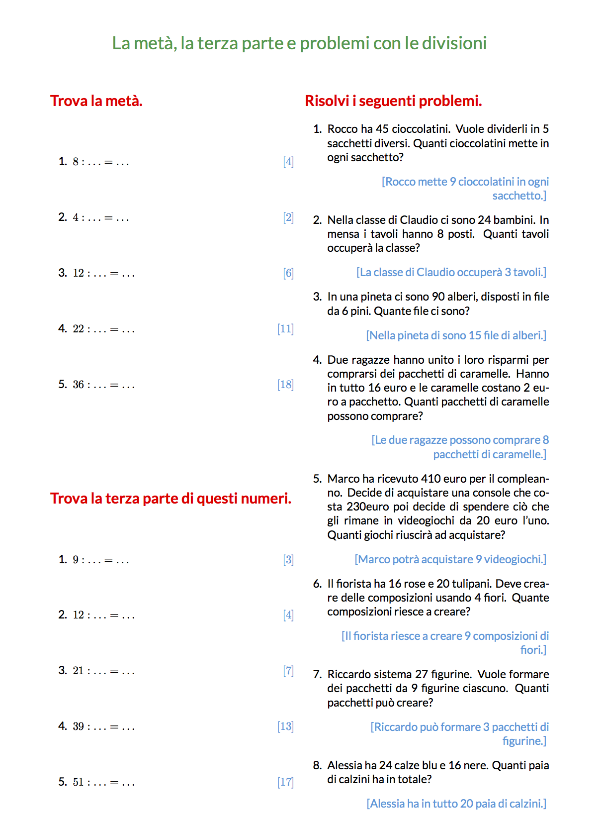 Infine, degli esercizi sul calcolo delle divisioni: la metà, la terza parte e tanti problemi da risolvere con le divisioni.