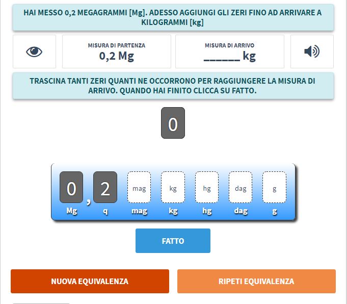 Trascina 0,2 sulla casella corrispondente ai megagrammi (Mg). A questo punto trascina due zeri fino a raggiungere la casella dei chilogrammi (kg). Clicca su FATTO e usa le frecce per spostare la virgola: 0,2 Mg = 200 kg