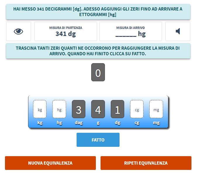 Trascina 341 sulla casella corrispondente ai decigrammi (dg). A questo punto trascina uno zero per arrivare alla casella degli ettogrammi (hg). Clicca su FATTO e usa le frecce per spostare la virgola: