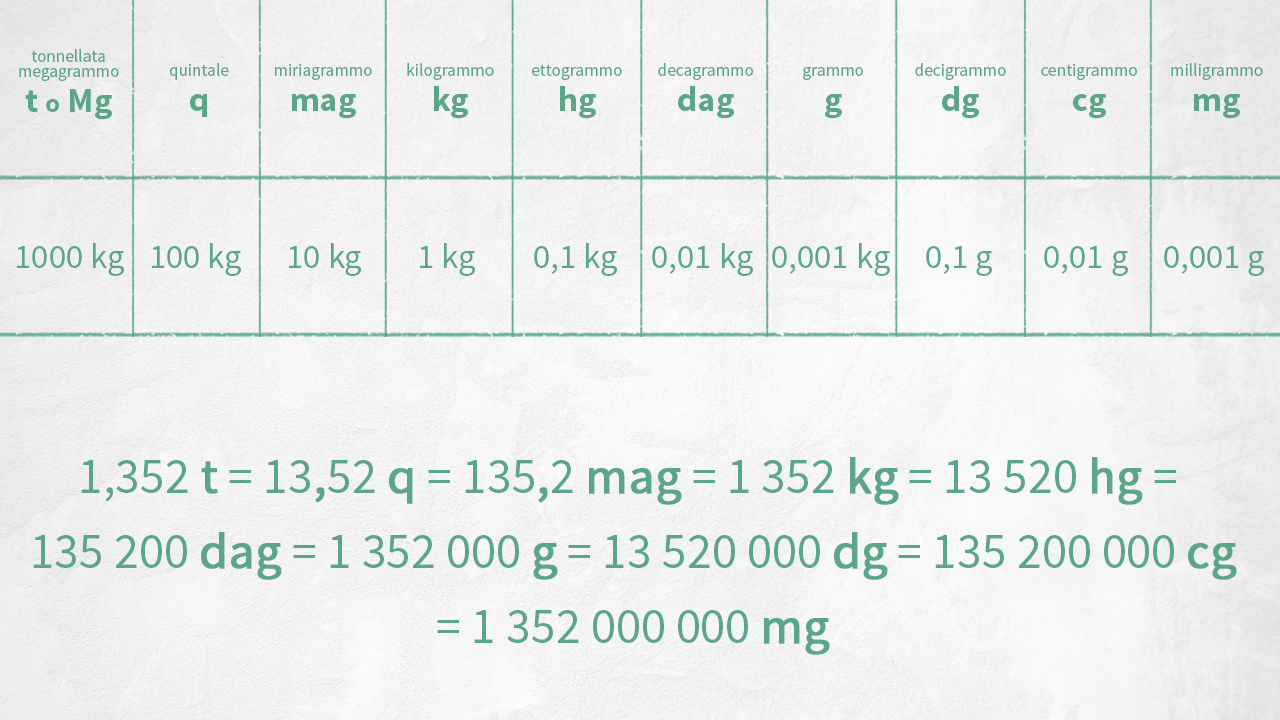 Puoi anche risolvere le equivalenze con i multipli del grammo sulla barra delle equivalenze interattiva: su questo strumento puoi trovare le unità di misura di massa dai grammi fino ai megagrammi o tonnellate.