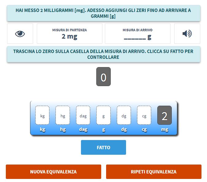 Trascina il 2 sulla casella corrispondente ai milligrammi (mg). A questo punto trascina lo zero sulla casella dei grammi (g): il sistema inserirà due zeri anche nelle caselle dei decigrammi (dg) e dei centigrammi (cg).