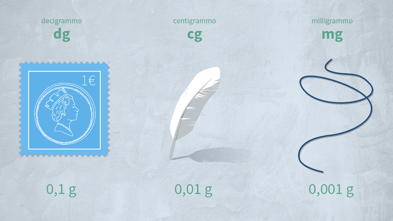 In chimica può servire misurare quantità ancora più piccole. Esistono anche i sottomultipli del grammo: il decigrammo, il centigrammo, il milligrammo. Così possiamo pesare anche una piuma!