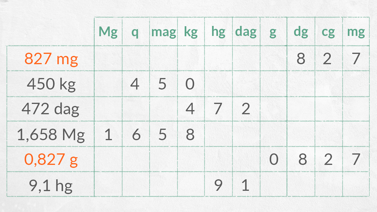 Il nostro sistema di numerazione è posizionale. Il valore di ogni cifra dipende dalla sua posizione! Anche per le misure di massa funziona ugualmente: ogni cifra indica un valore diverso. Per capire qual è questo valore, controlliamo l’unità di misura indicata, cioè la marca: si riferisce alle unità del numero scritto. Sapendo ciò, possiamo scomporre il numero in grammi, chilogrammi, multipli e sottomultipli.