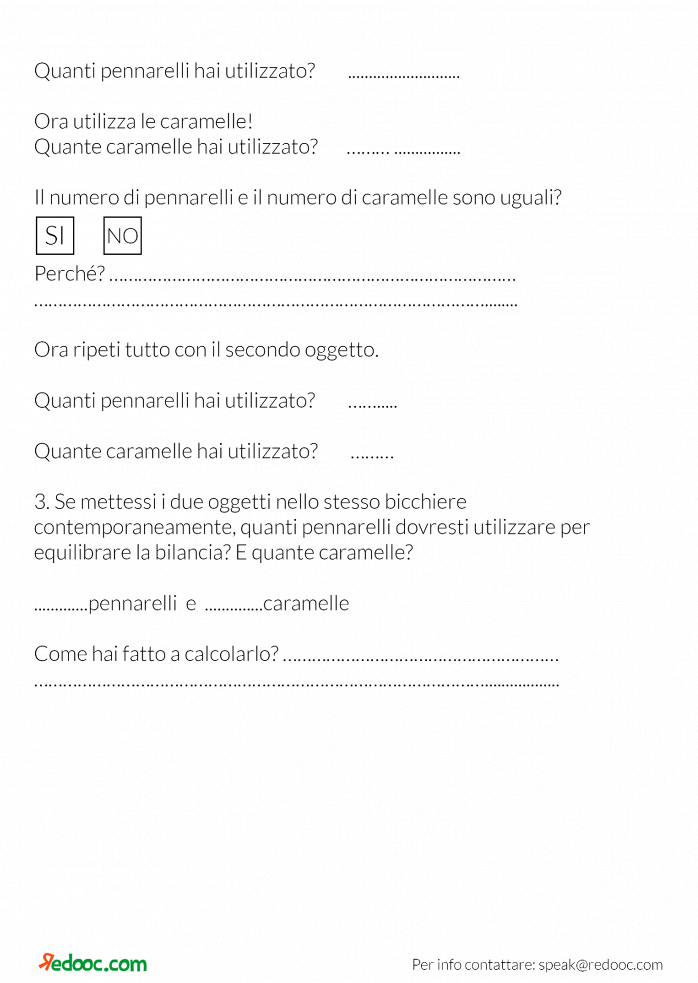 Un primo approccio alla misura di massa: questa bilancia non ci fornisce la misura delle masse con le unità di misura che conosceremo. Vogliamo però insistere sul fatto che per poter misurare, occorre fissare un’unità di misura condivisa da tutti. Scegliete quale oggetto utilizzare come unità di misura: per esempio i regoli da 3, i pezzi di lego tutti grossi uguali, le caramelle… Utilizzate quindi la bilancia appena costruita per pesare quello che c’è in classe: quante caramelle pesa una penna? Quanti lego pesa una gomma?