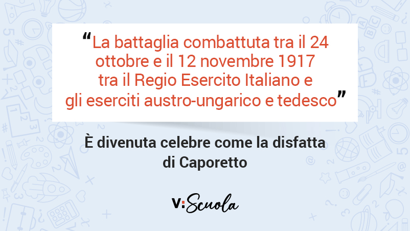 Tra il 24 ottobre e il 12 novembre 1917, durante la I Guerra Mondiale, il Regio Esercito Italiano fu sconfitto da austro-ungarici e tedeschi in quella che è passata alla storia come la "disfatta di Caporetto", la più grave mai subita dal nostro Paese