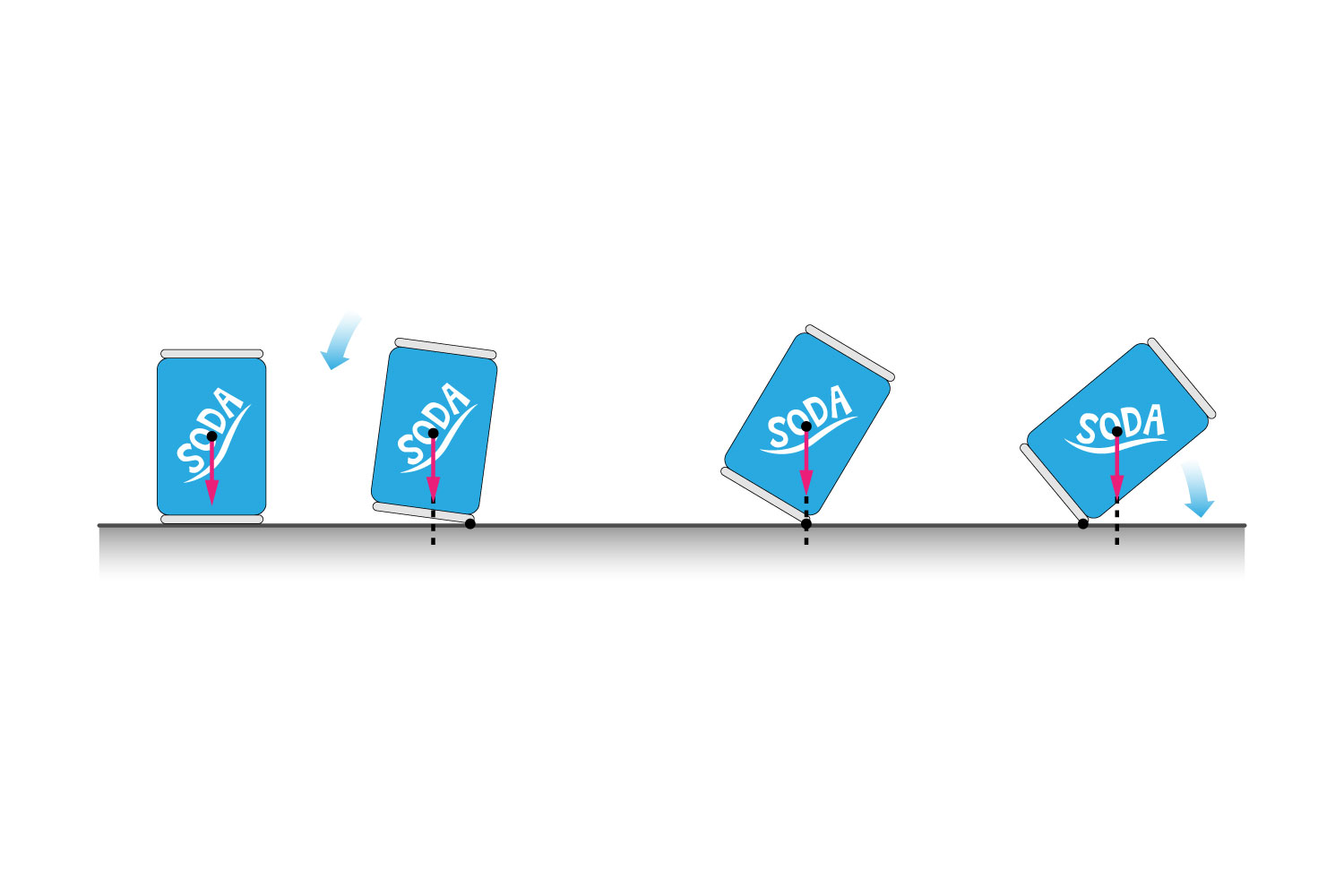 - EQUILIBRIO INSTABILE si ottiene quando la verticale condotta dal baricentro cade fuori dalla base d’appoggio dell’oggetto. In questo caso se sposto l’oggetto si muove e può cadere;