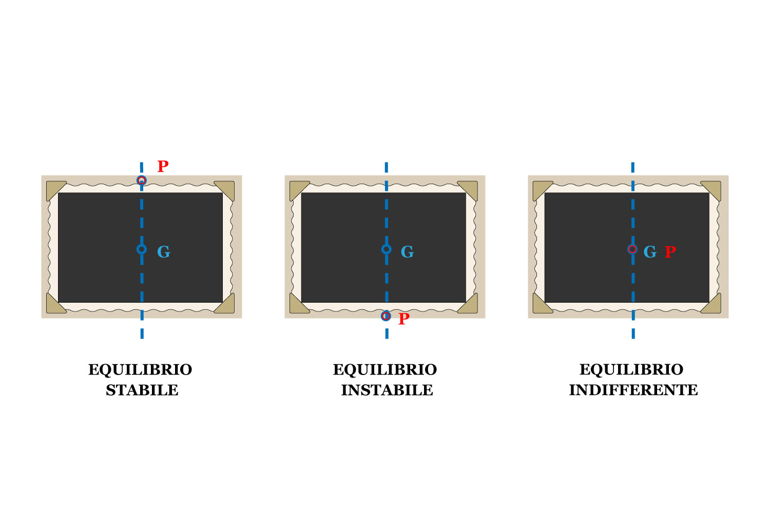 - EQUILIBRIO STABILE si ottiene quando il punto di sospensione è sopra il centro di gravità. In questo caso se sposto l’oggetto può oscillare, ma poi torna nella posizione originale;