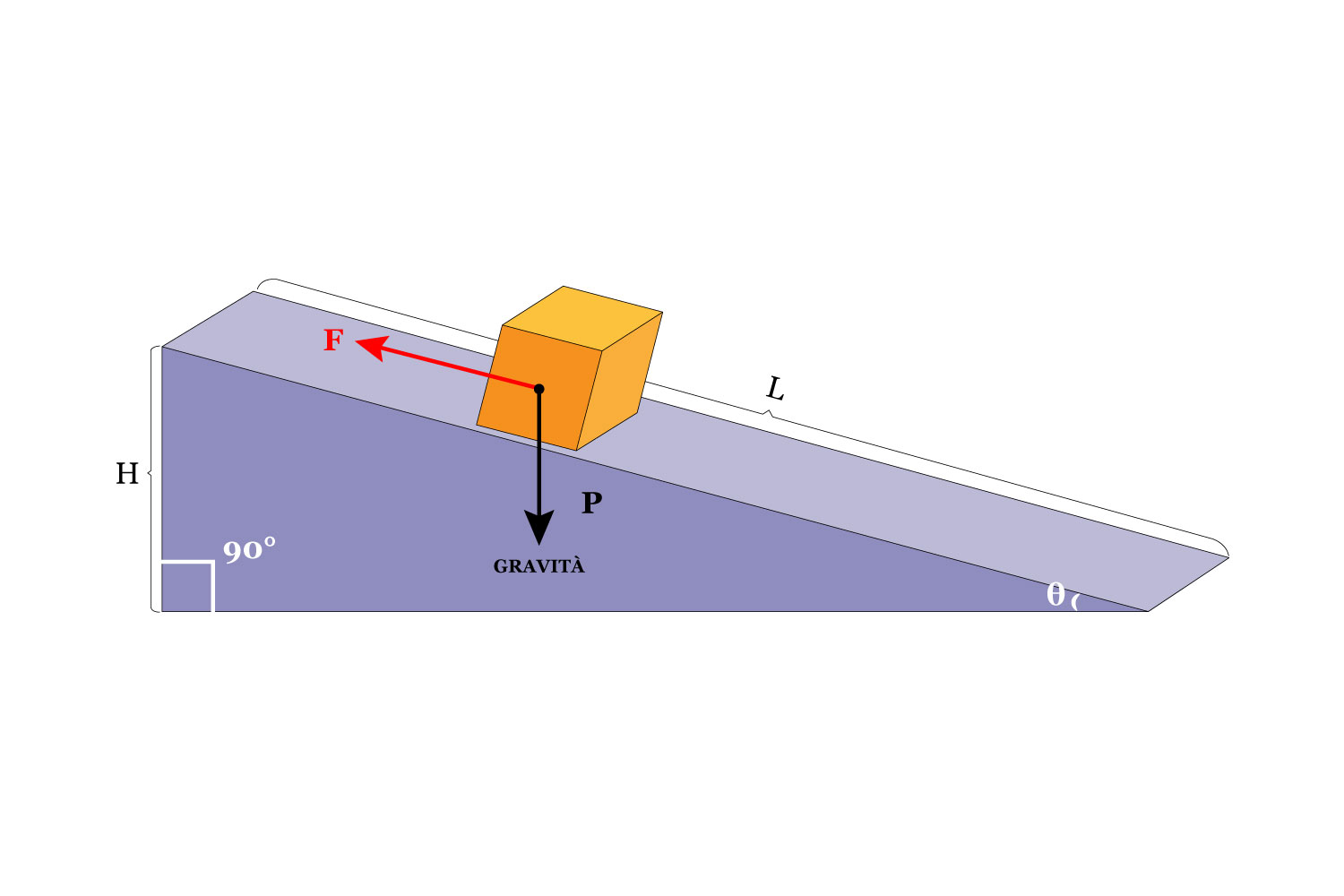 Immaginiamo di appoggiare una cassa su un piano inclinato e ignoriamo la forza d’attrito che agisce a nostro favore. Consideriamo solamente la forza peso data dalla gravità e dalla massa della cassa.