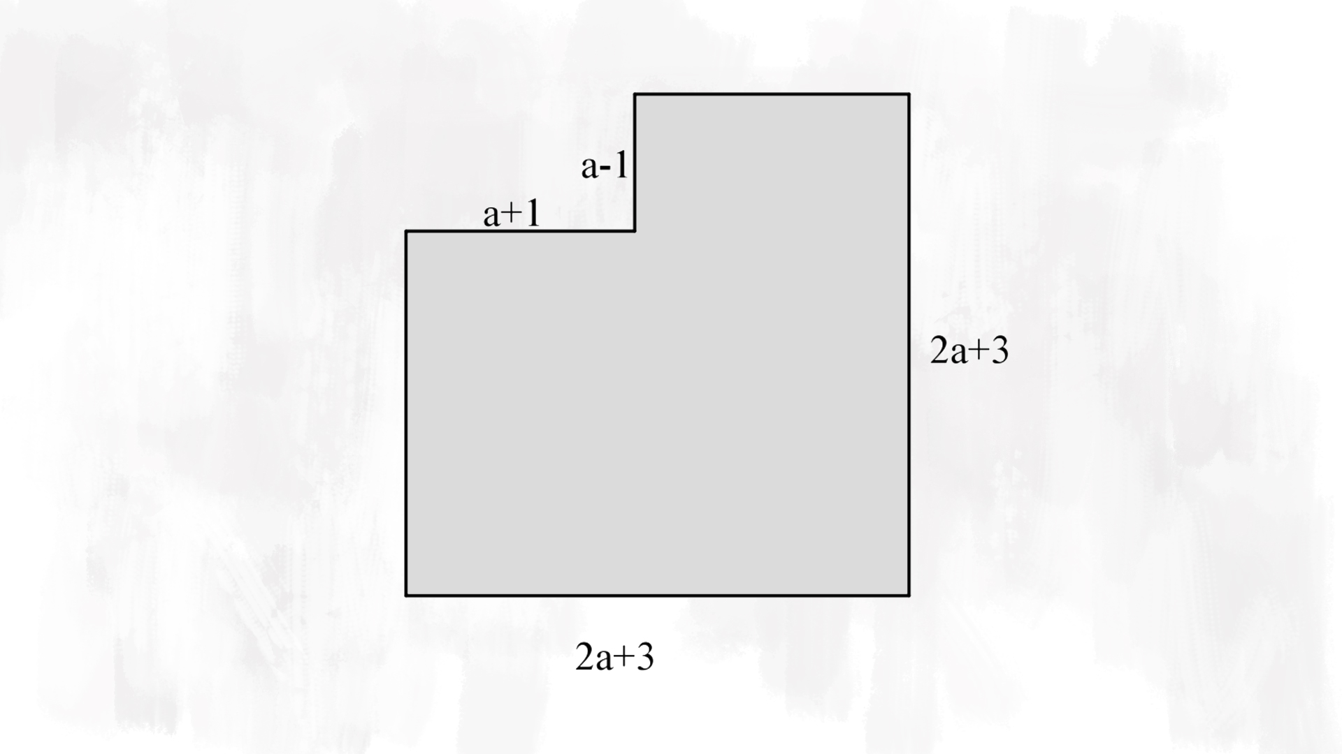 L’area della figura è data dall’area del quadrato grande (di lato £$2a+3$£) a cui va sottratta l’area del rettangolo di lati £$a+1$£ e £$a-1$£. Quindi: