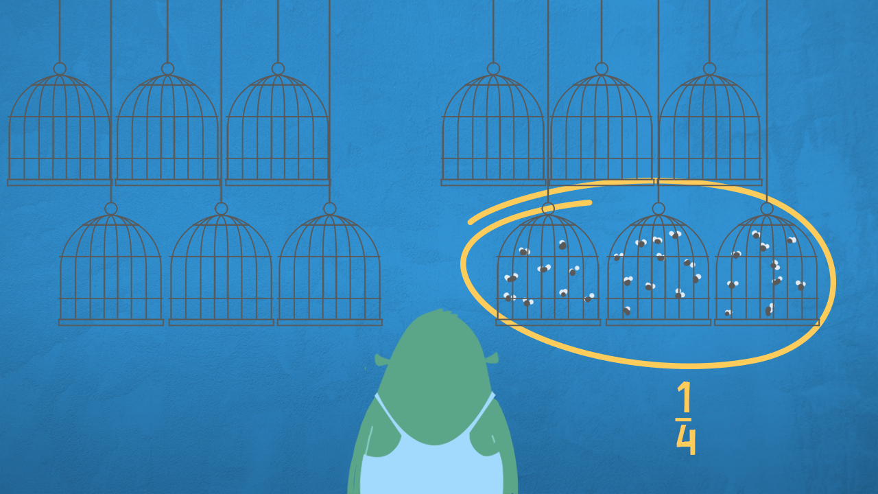 I £$ \dfrac 34 $£ di 12 sono 9 gabbiette. Significa quindi che 9 gabbiette sono vuote, di conseguenza 12 – 9 = 3, rimangono 3 gabbiette piene.