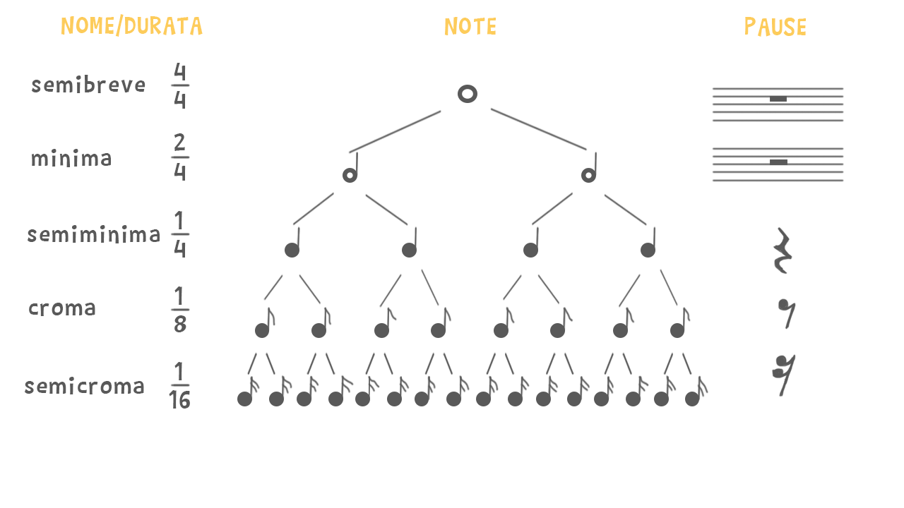 Le frazioni sono utili anche per leggere la musica. Conosci il pentagramma? È lo spazio in cui scriviamo la musica: è formato da £$ 5 $£ linee parallele e £$ 4 $£ spazi. È suddiviso con stanghette verticali che indicano le battute. All’inizio del pentagramma troviamo la chiave di violino (o chiave di sol) che serve a fissare la posizione delle note (esistono anche la chiave di basso o chiave di fa e le chiavi di do) e una frazione che indica la durata di ciascuna battuta. Le durate più comuni sono £$ \frac{4}{4} , \frac{3}{4}, \frac{2}{4} $£, ma anche £$ \frac{3}{8}, \frac{6}{8} $£… In ogni battuta, quindi, può starci un certo numero di note: anche queste hanno un valore e un nome diverso in base alla durata! Per esempio, in una battuta da £$ \frac{4}{4} $£ possiamo scrivere £$ 4 $£ note da £$ \frac{1}{4} $£, oppure £$ 2 $£ note da £$ \frac{2}{4} $£. In musica non ci sono solo le note: anche le pause hanno valori diversi e scritture diverse. Per completare una battuta possiamo inserire note e pause di valori diversi.
