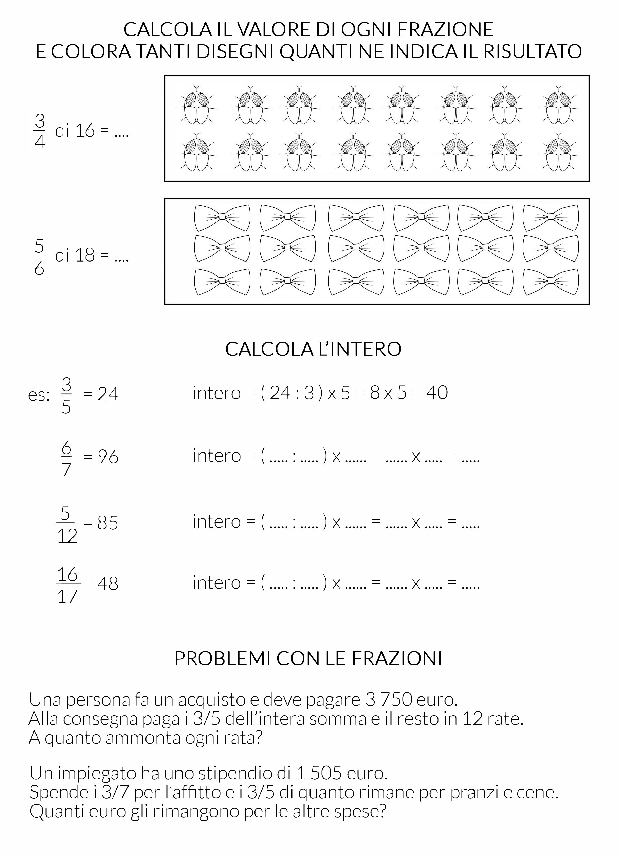 Nella scheda qualche esercizio per imparare a calcolare dapprima la frazione di un numero come applicazione del procedimento, poi all’interno di un problema più complesso.