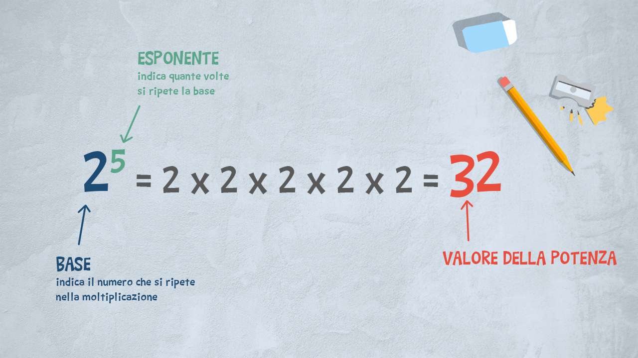 2 x 2 x 2 x 2 x 2 = 2£$^5$£ lo stesso fattore, il 2, moltiplicato per se stesso 5 volte: questa è una potenza!