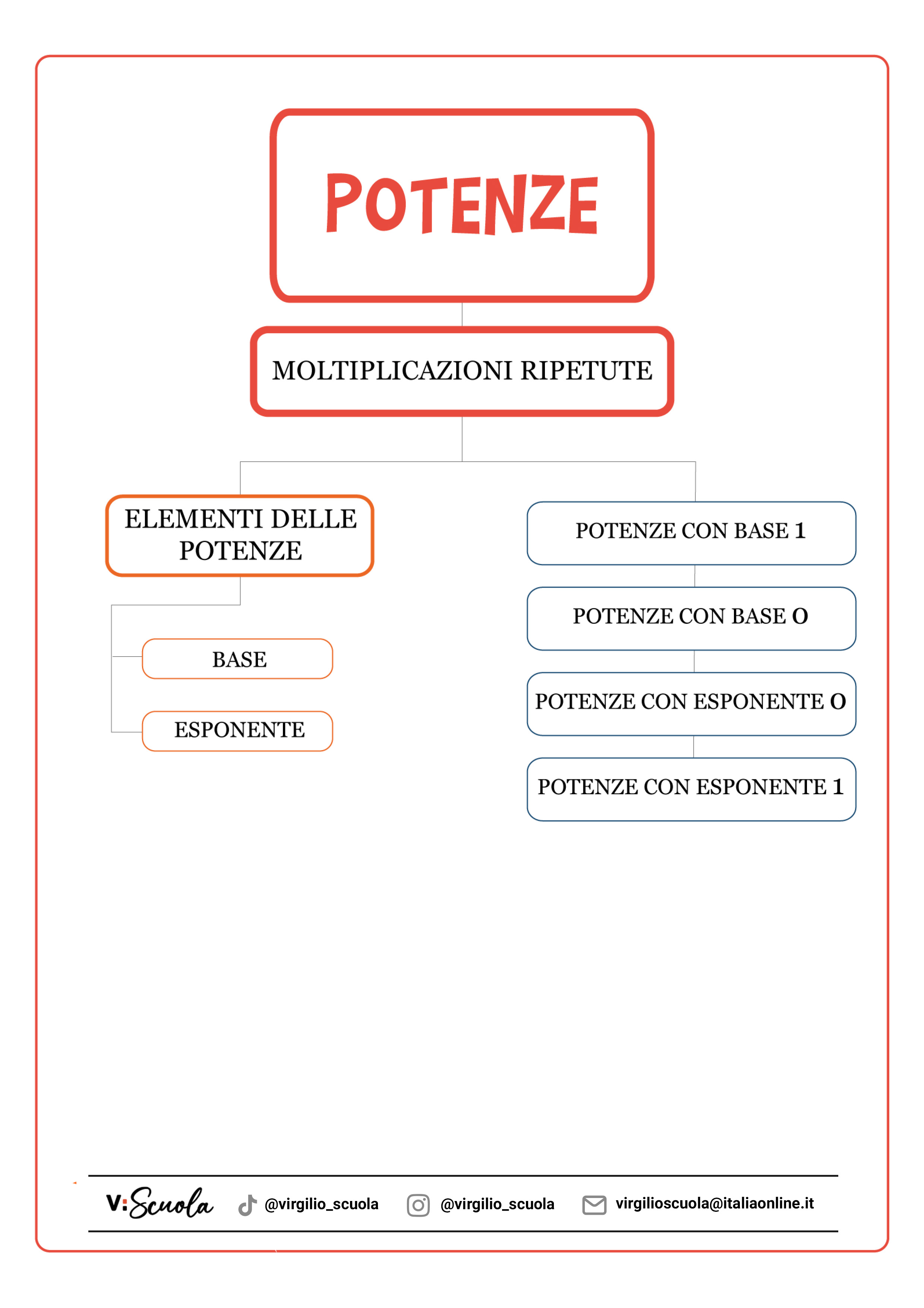 Consulta, scarica e stampa la mappa mentale delle potenze. Ripassa il nome dei termini e non dimenticare mai come funzionano le potenze di 0 e di 1!