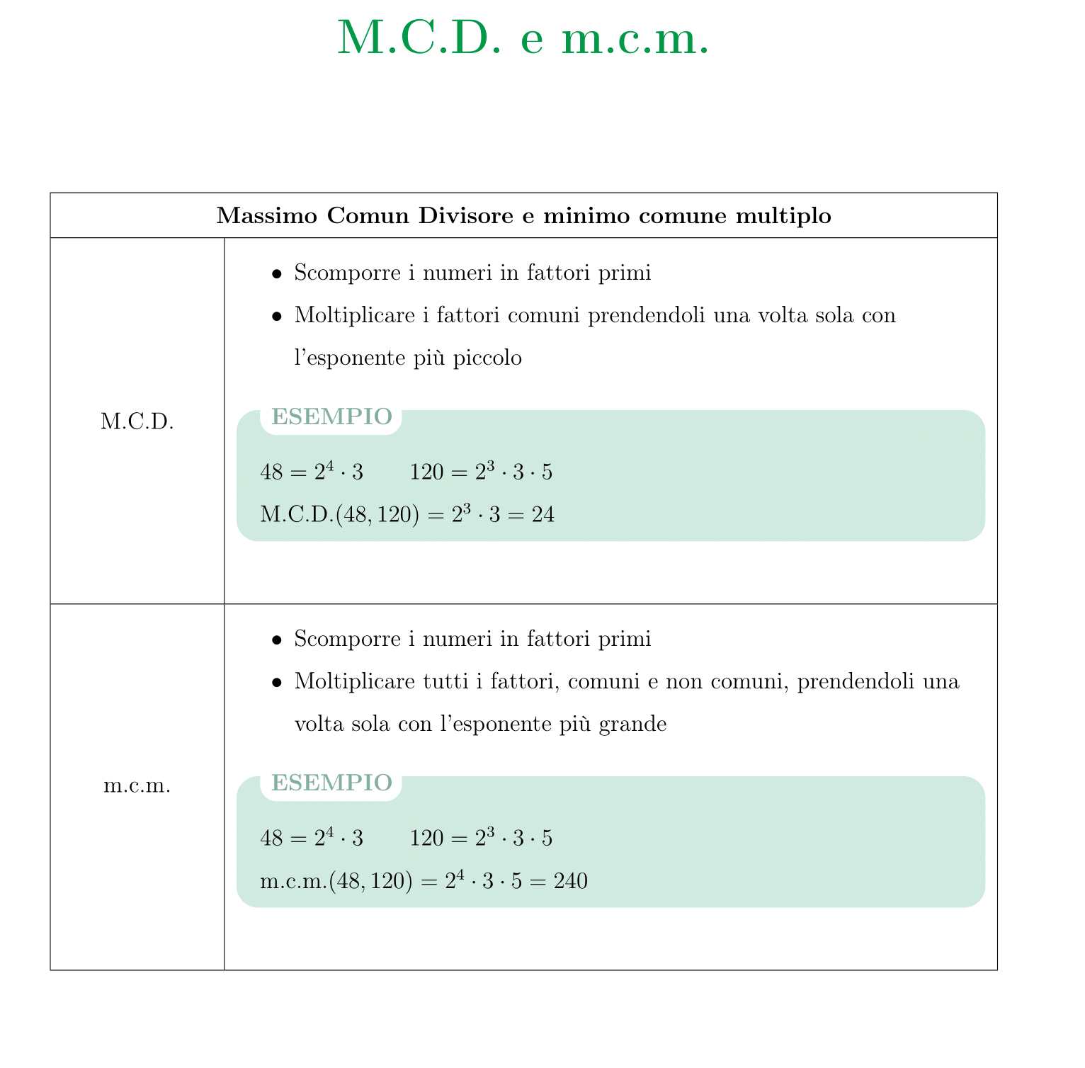 Esempio: £$\text{M.C.D.}(48, 120) = 24$£. Infatti £$48 = 2^4 \cdot 3$£ e £$120 = 2^3 \cdot 3 \cdot 5$£. Scegliamo solo i fattori comuni (cioè £$ 2 $£ e £$ 3 $£) con l’esponente minore, quindi: £$\text{M.C.D.}(48, 120) = 2^3 \cdot 3 = 24$£.