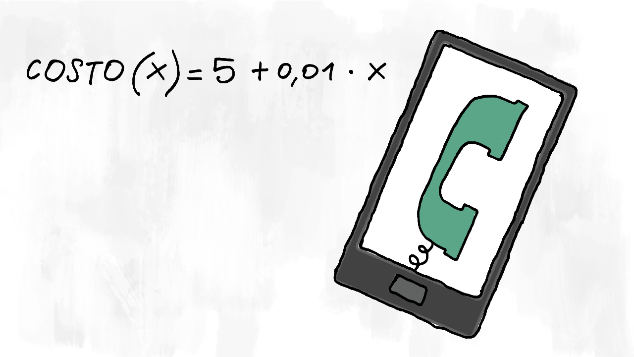 Chiamiamo la funzione £$ c $£ e indichiamo con la variabile indipendente £$ x $£ i minuti (interi arrotondati per eccesso) di chiamate. La nostra spesa mensile sarà indicata dalla funzione £$ c(x) = 5 + 0,01 \cdot x $£.