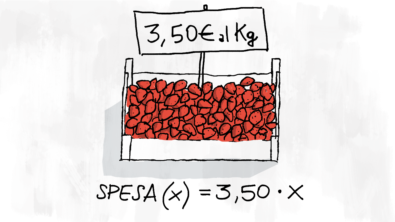 Esempio: le fragole costano £$ 3,50 $£ € al chilo. Possiamo scrivere la funzione £$ s $£ della spesa in questo modo: £$ s(x) = 3,5 \cdot x $£ dove indichiamo con £$ x $£ la quantità di fragole che compriamo in chilogrammi.