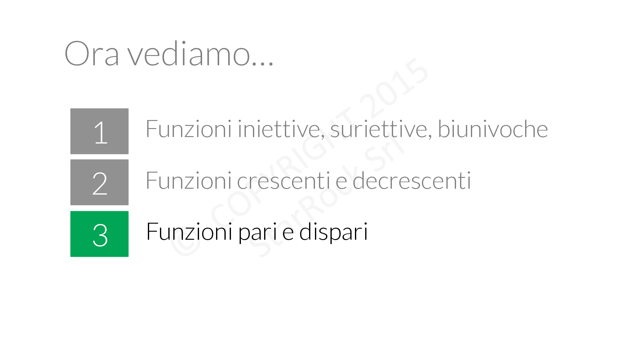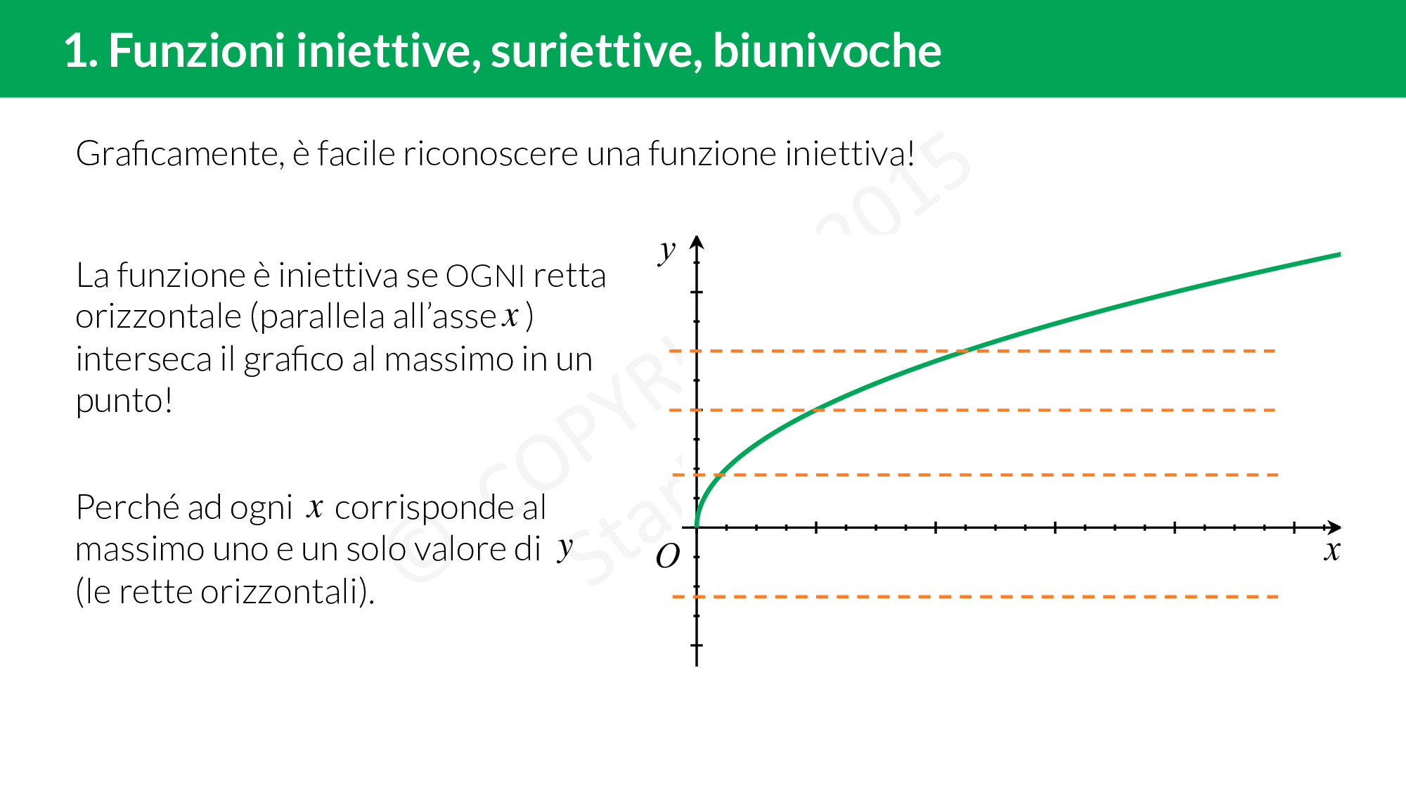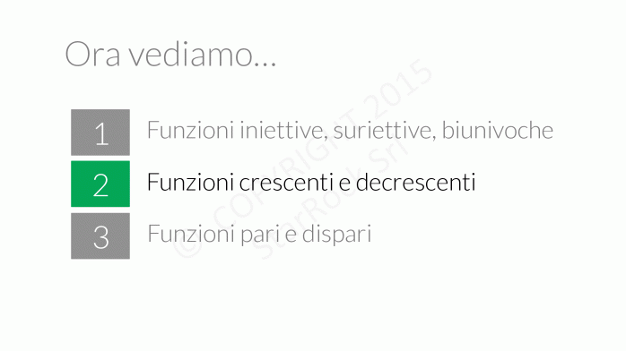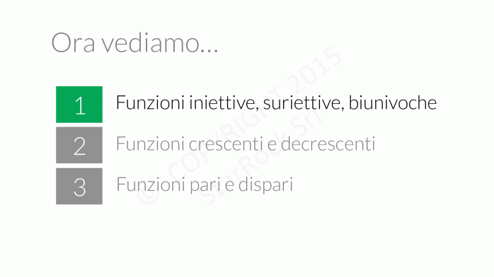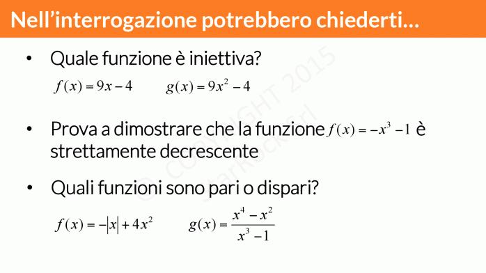 - funzioni iniettive, suriettive, biunivoche: le funzioni hanno delle proprietà che possiamo usare per studiarle meglio e più velocemente,