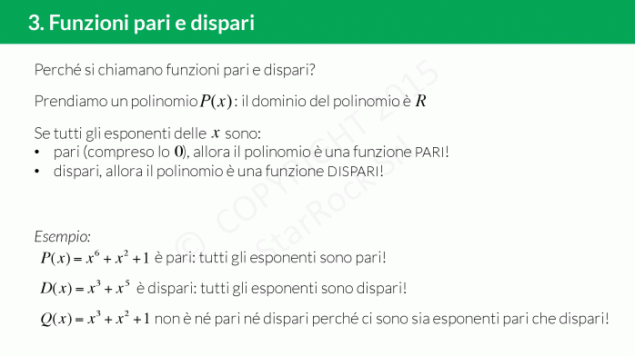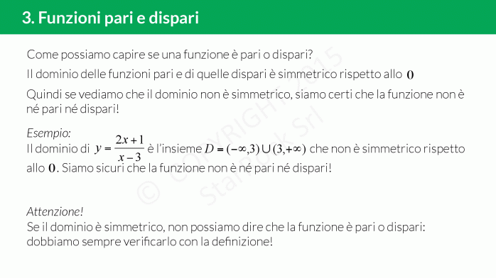 A cosa serve sapere se una funzione è pari o dispari? Ci permette di studiare la funzione solo per £$x \ge 0 $£ perché per le [iol_placeholder type="formula" engine="katex" display="inline"]x