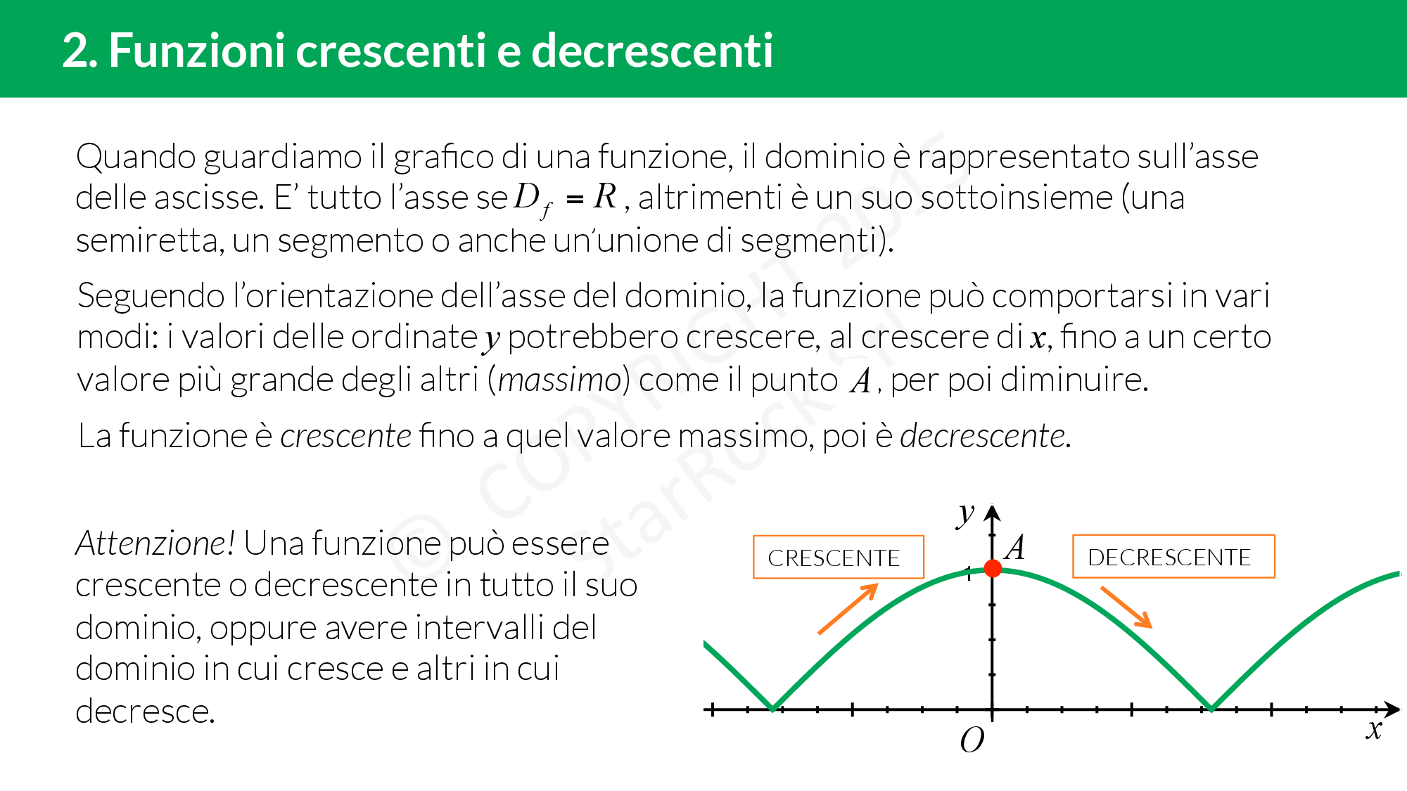 Una funzione può essere crescente o decrescente in tutto il dominio, oppure crescente in un intervallo e decrescente in un altro.