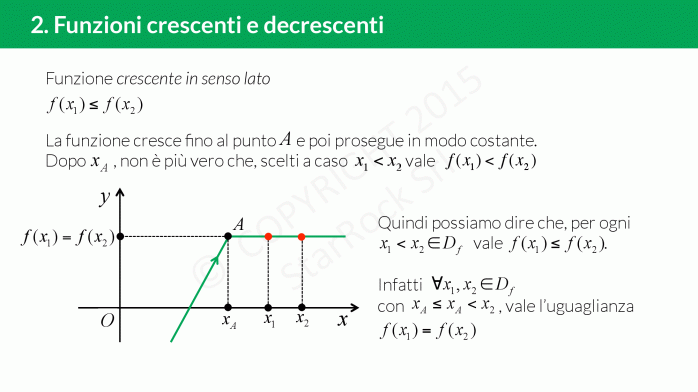 Una funzione è crescente se presi £$x_1 $£ e £$ x_2 $£ tali che £$x_1 \le x_2$£ allora £$ f(x_1) \le f(x_2) $£. Il grafico della funzione “va verso l’alto".