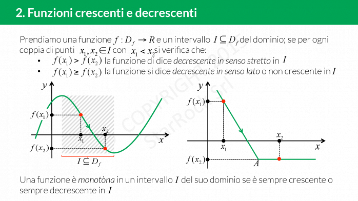 - funzioni crescenti e decrescenti: lo studio degli intervalli di monotonia della funzione è importante per capirne il comportamento,