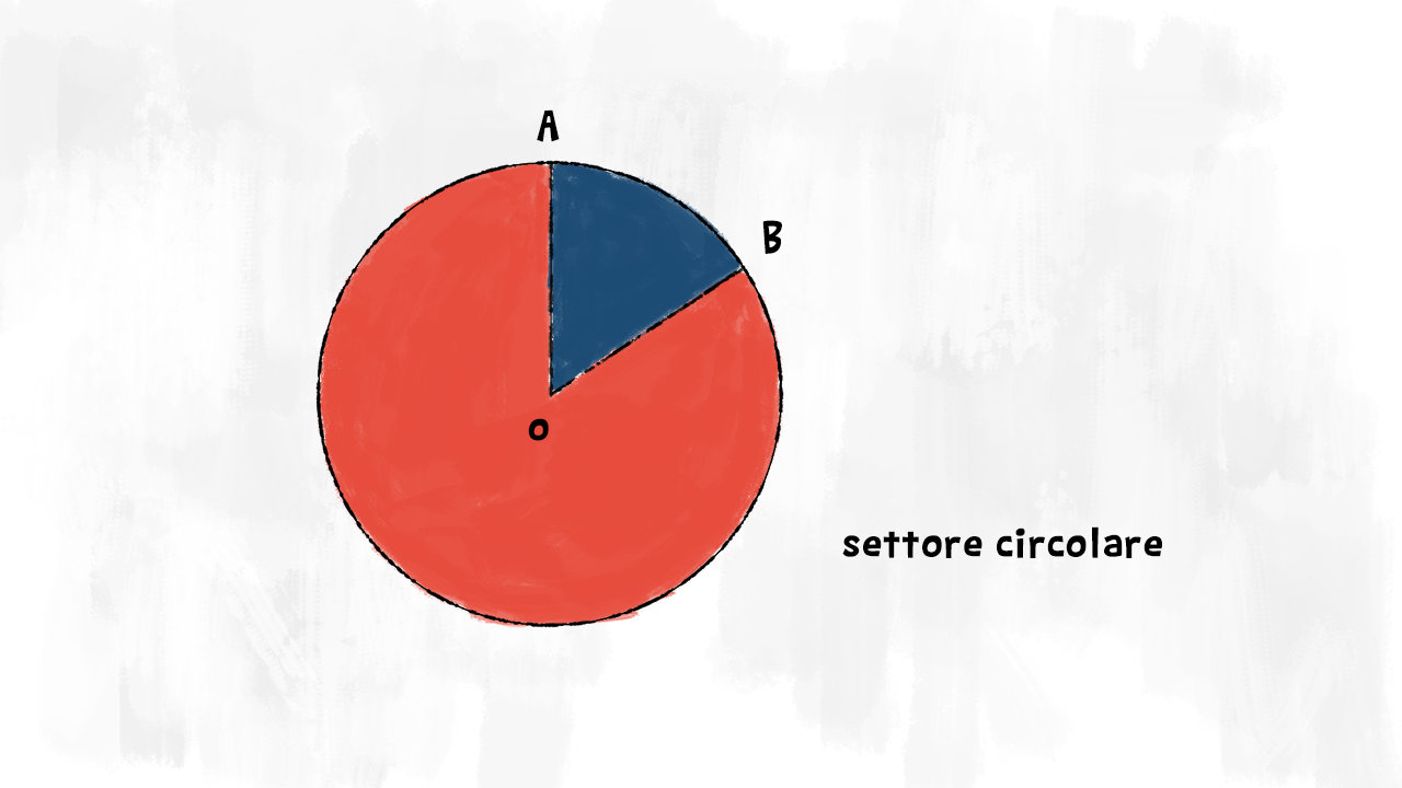 Come si chiama invece una fetta di cerchio? La parte di cerchio delimitata da due raggi e dall’arco di circonferenza compreso tra questi si chiama settore circolare. In una circonferenza di centro £$ O $£ disegniamo due raggi £$ OA $£ e £$ OB $£: indichiamo il settore circolare delimitato dall’arco £$ \overgroup{AB} $£ con i suoi tre vertici, come facciamo con i triangoli, ma utilizzando una linea curva, in questo modo £$ \overgroup{AOB} $£.