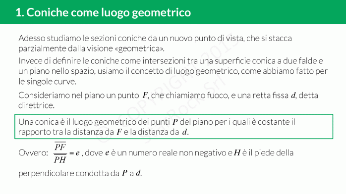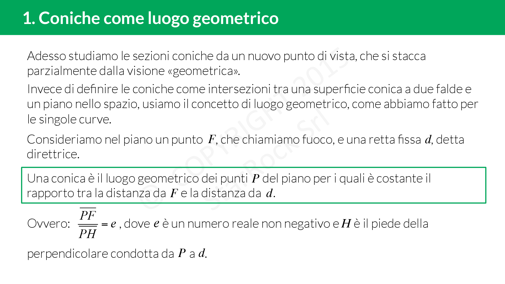 Una conica è il luogo geometrico dei punti £$P$£ del piano per i quali è costante il rapporto tra la distanza dal fuoco e la distanza dalla direttrice. Chiamiamo questo rapporto £$e$£ (eccentricità) e lo usiamo per caratterizzare la conica: