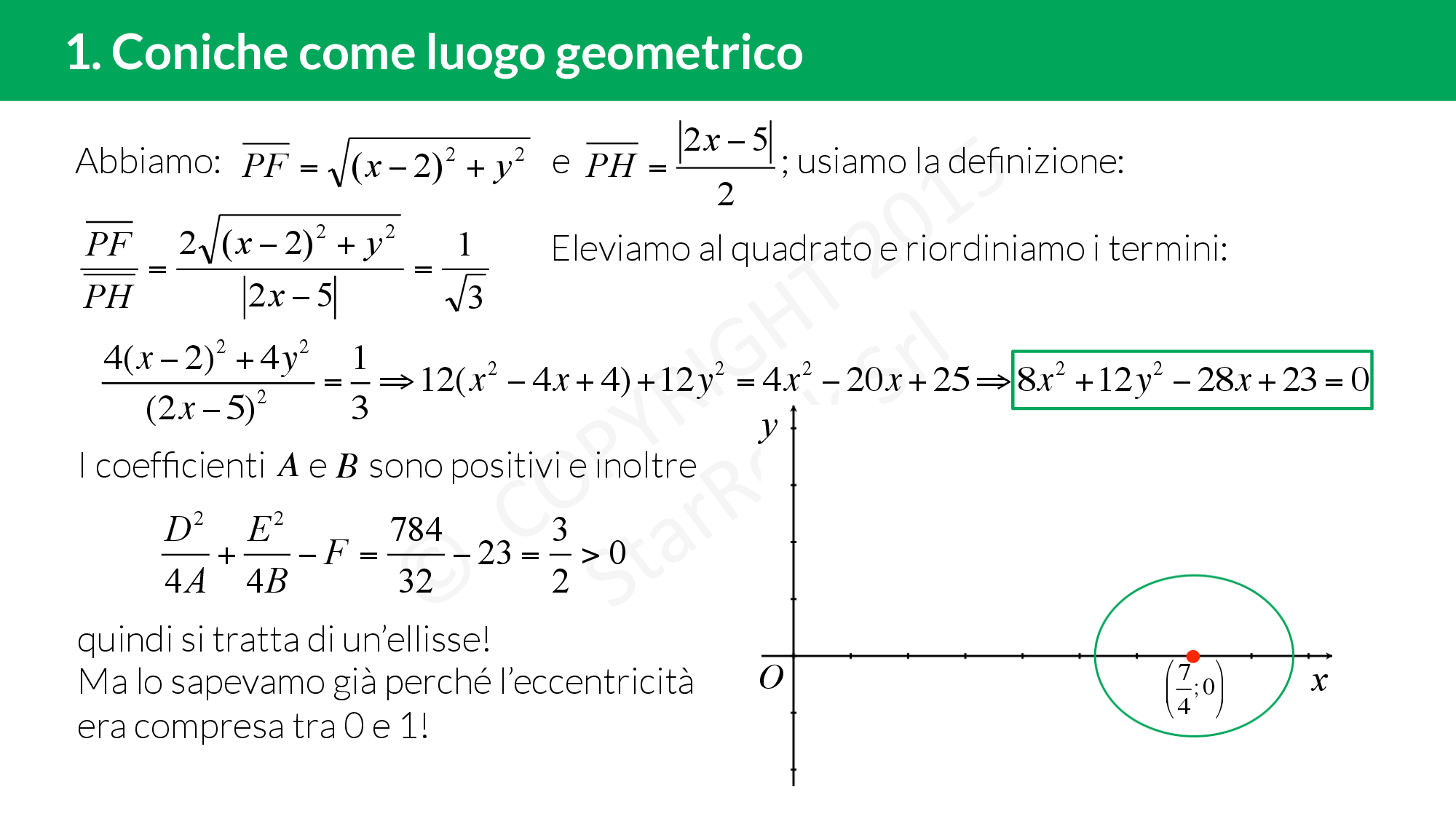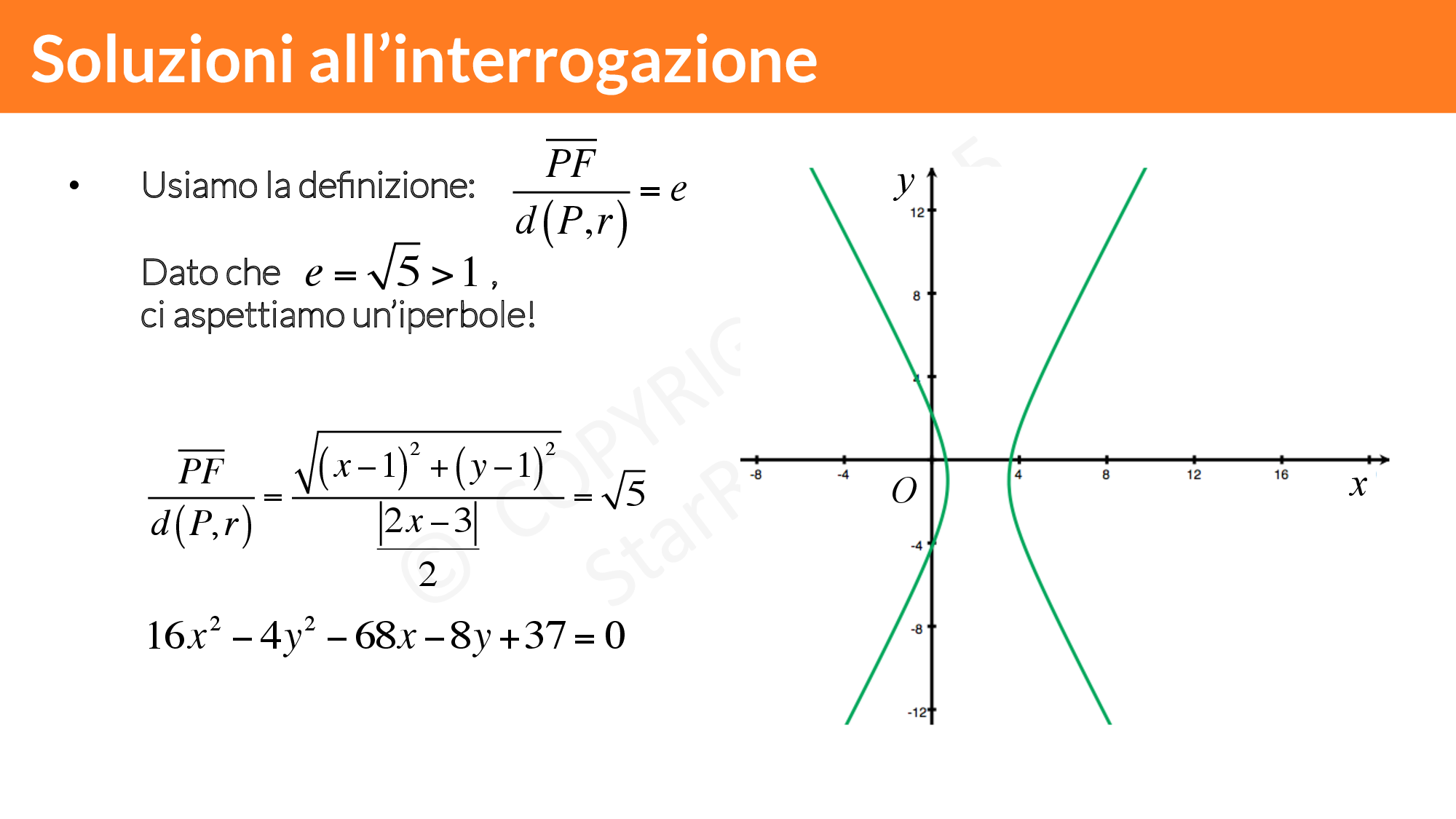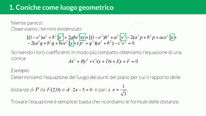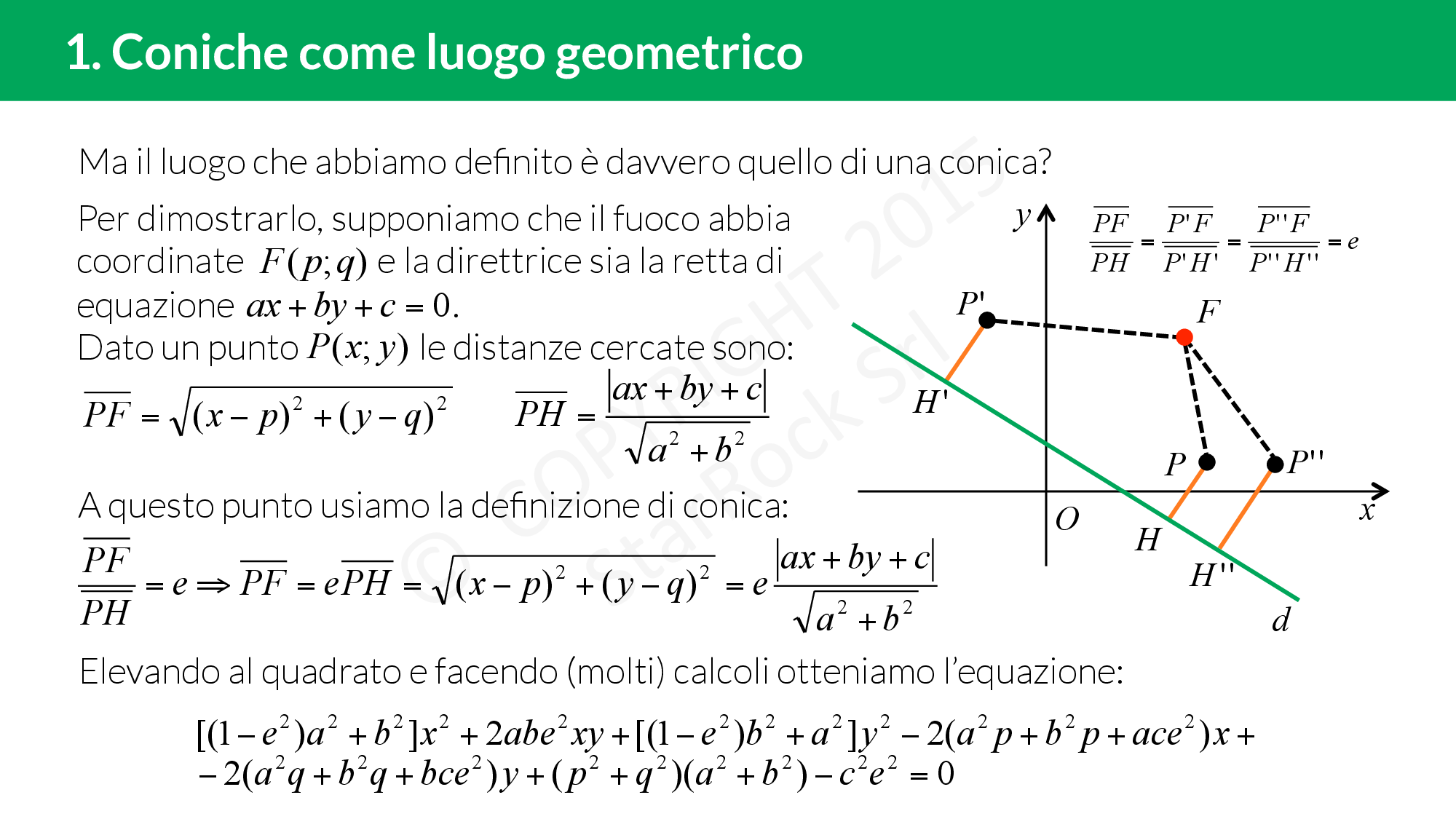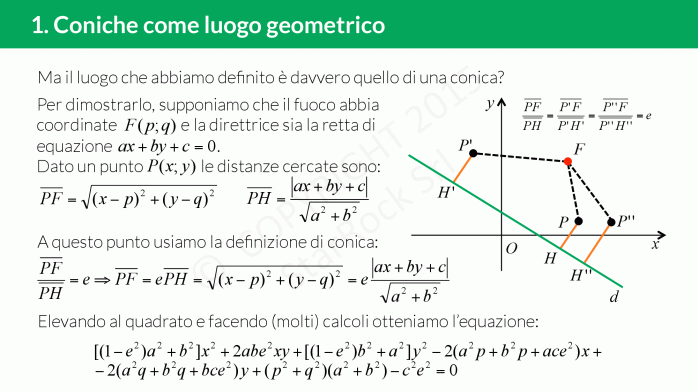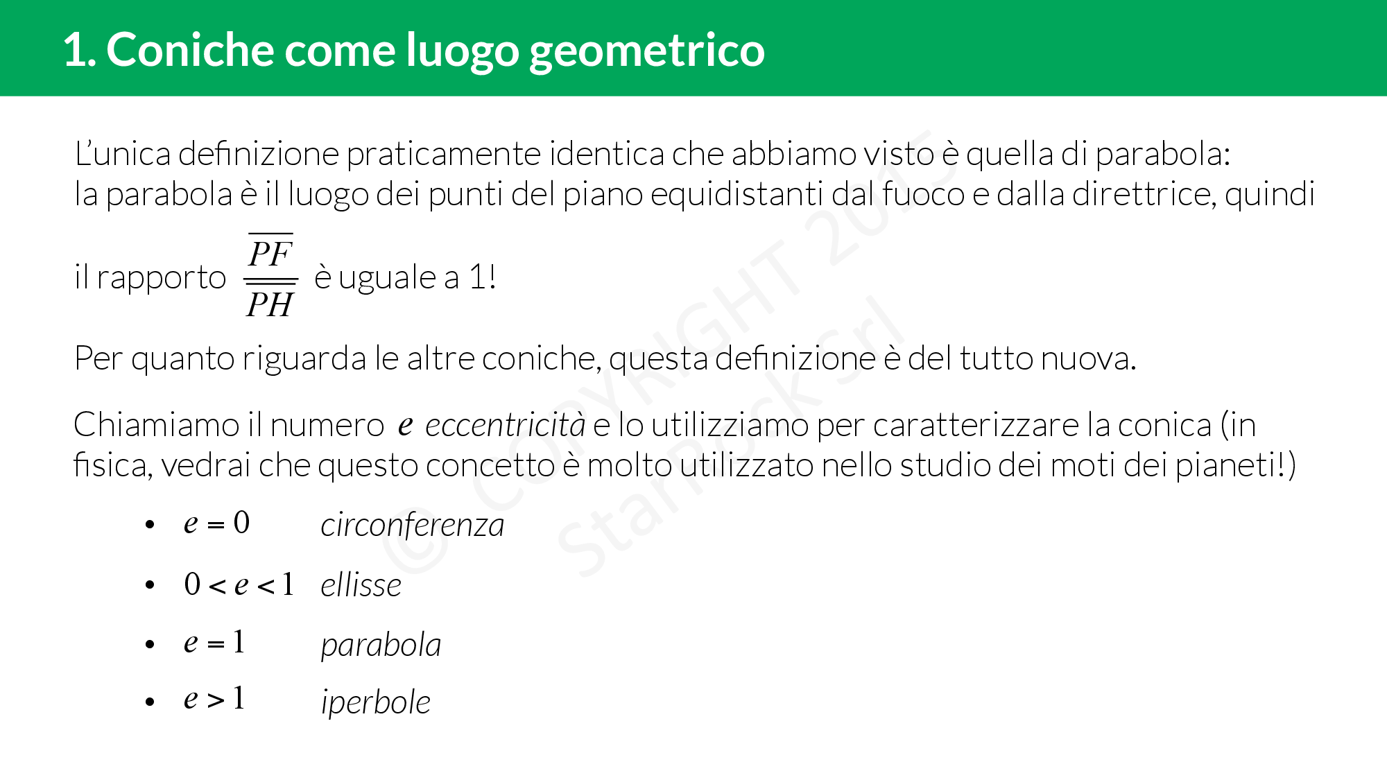 In questa lezione vedrai come riconoscere una conica dal valore dell’eccentricità, cioè dal valore del rapporto tra la distanza dal fuoco e la distanza tra la direttrice. Scoprirai anche che l’ellisse e l’iperbole hanno due direttrici!