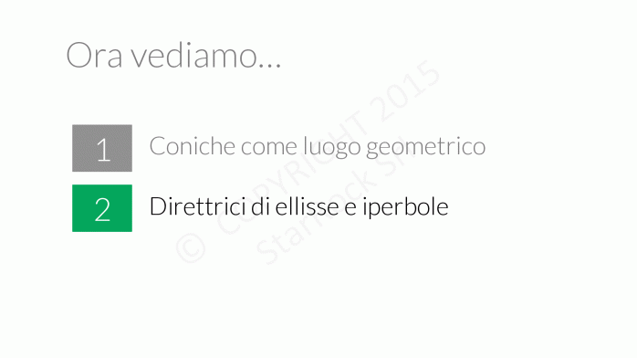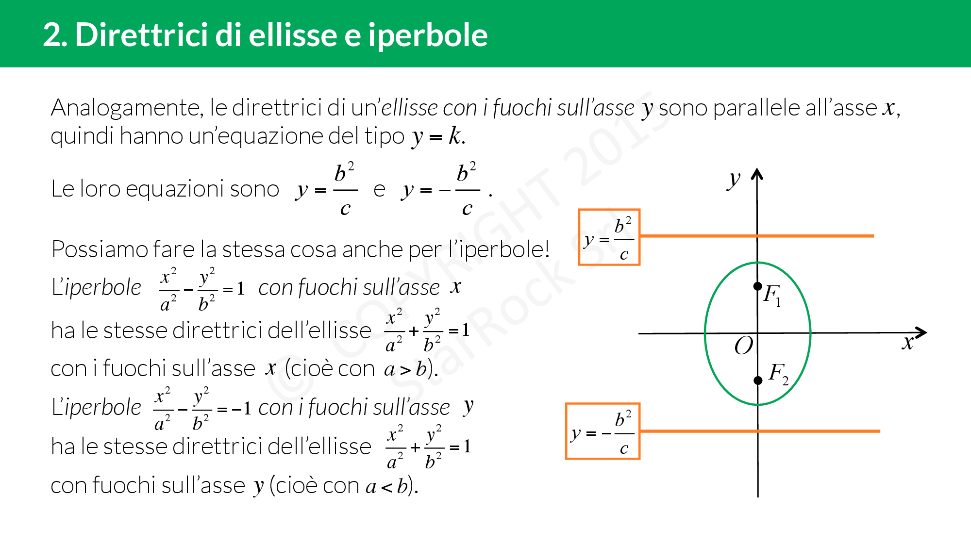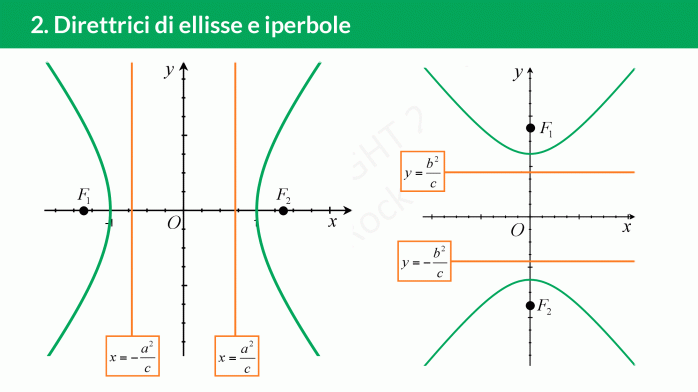 Per l’ellisse e l’iperbole con i fuochi sull’asse £$x$£ abbiamo £$x=\pm\frac{a^2}{c}$£ mentre se i fuochi sono sull’asse £$y$£ otteniamo £$x=\pm\frac{b^2}{c}$£.