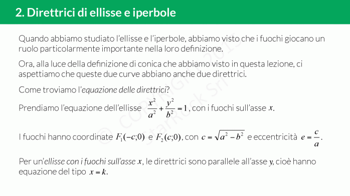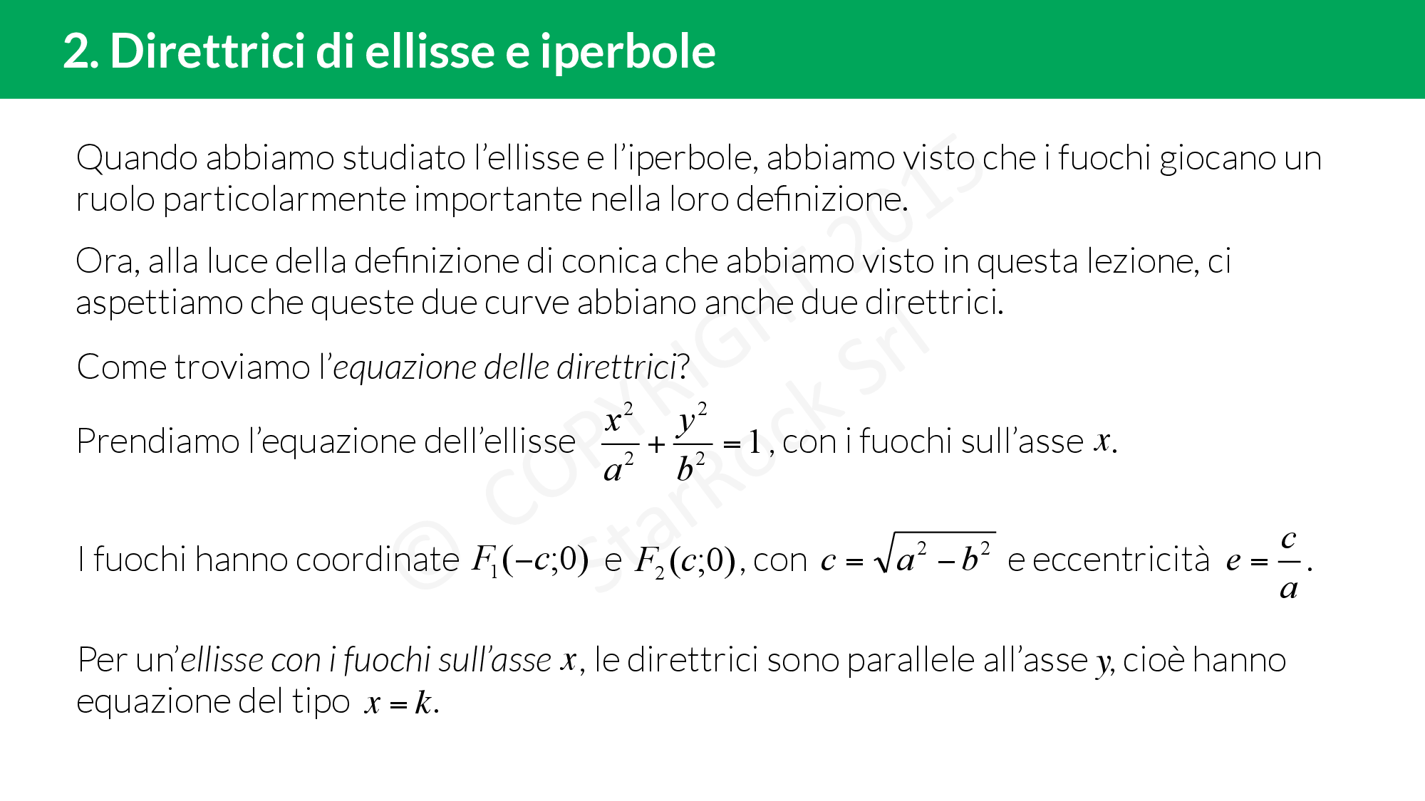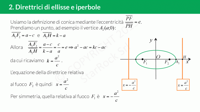 Quando abbiamo studiato l’ellisse e l’iperbole, abbiamo visto che i fuochi giocano un ruolo importante nella loro definizione. Ora ci aspettiamo che queste due curve abbiano anche due direttrici. Ma quali sono le equazione delle direttrici?