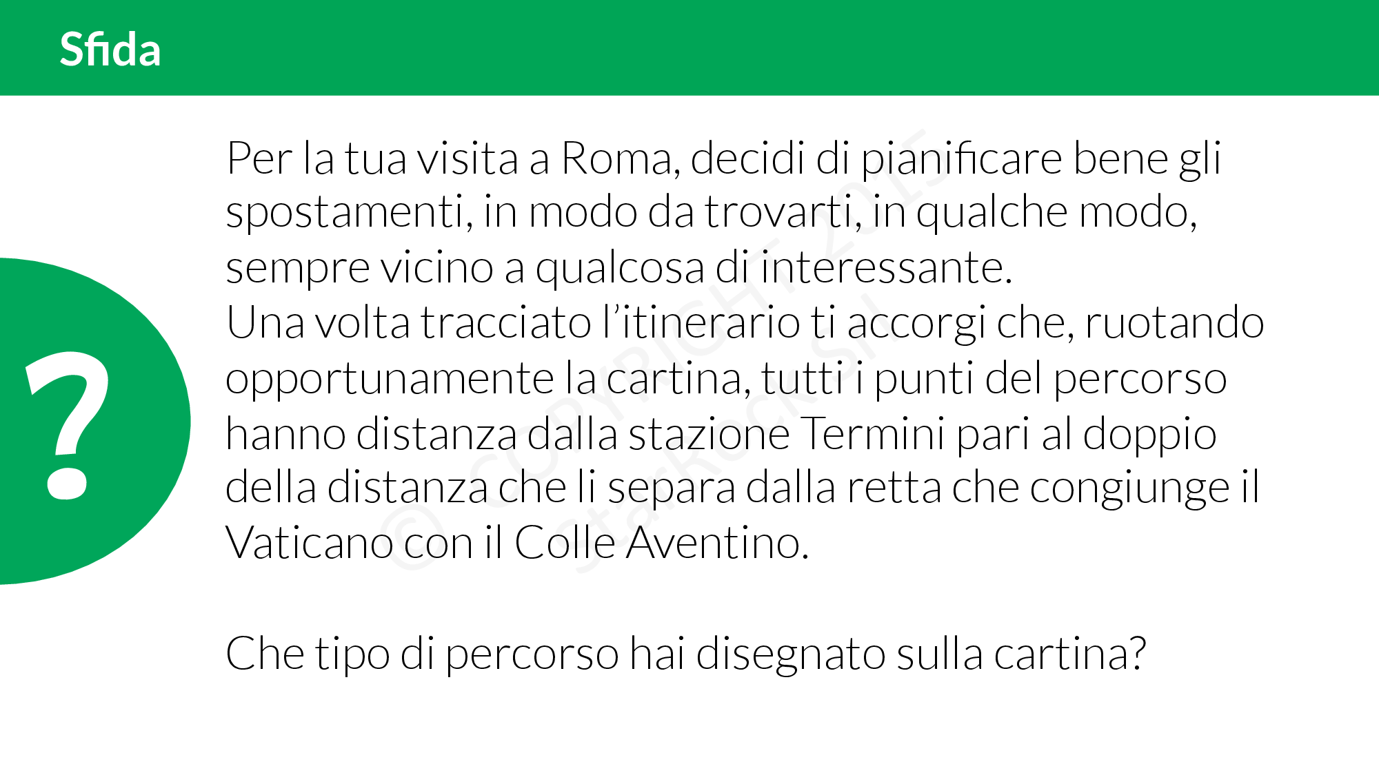 Dopo aver tracciato l’itinerario sulla cartina di Roma ti accorgi che, ruotandola opportunamente, tutti i punti del percorso hanno distanza dalla stazione Termini pari al doppio della distanza che li separa dalla retta che congiunge il Vaticano con il Colle Aventino. Che tipo di percorso hai disegnato sulla cartina?