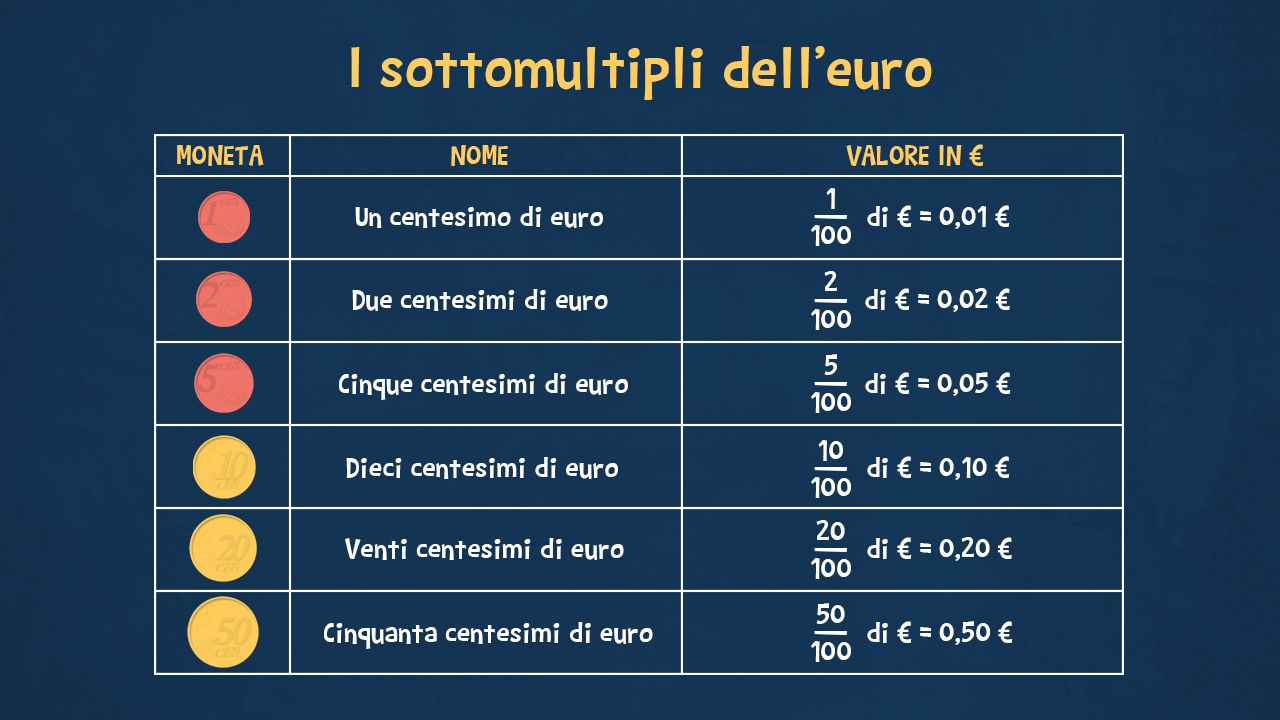 Vi invitiamo a realizzare un bel cartellone in cui poter raccogliere tutti i sottomultipli: a partire dalla moneta da un euro, scomponetela in monete sempre più piccole.
